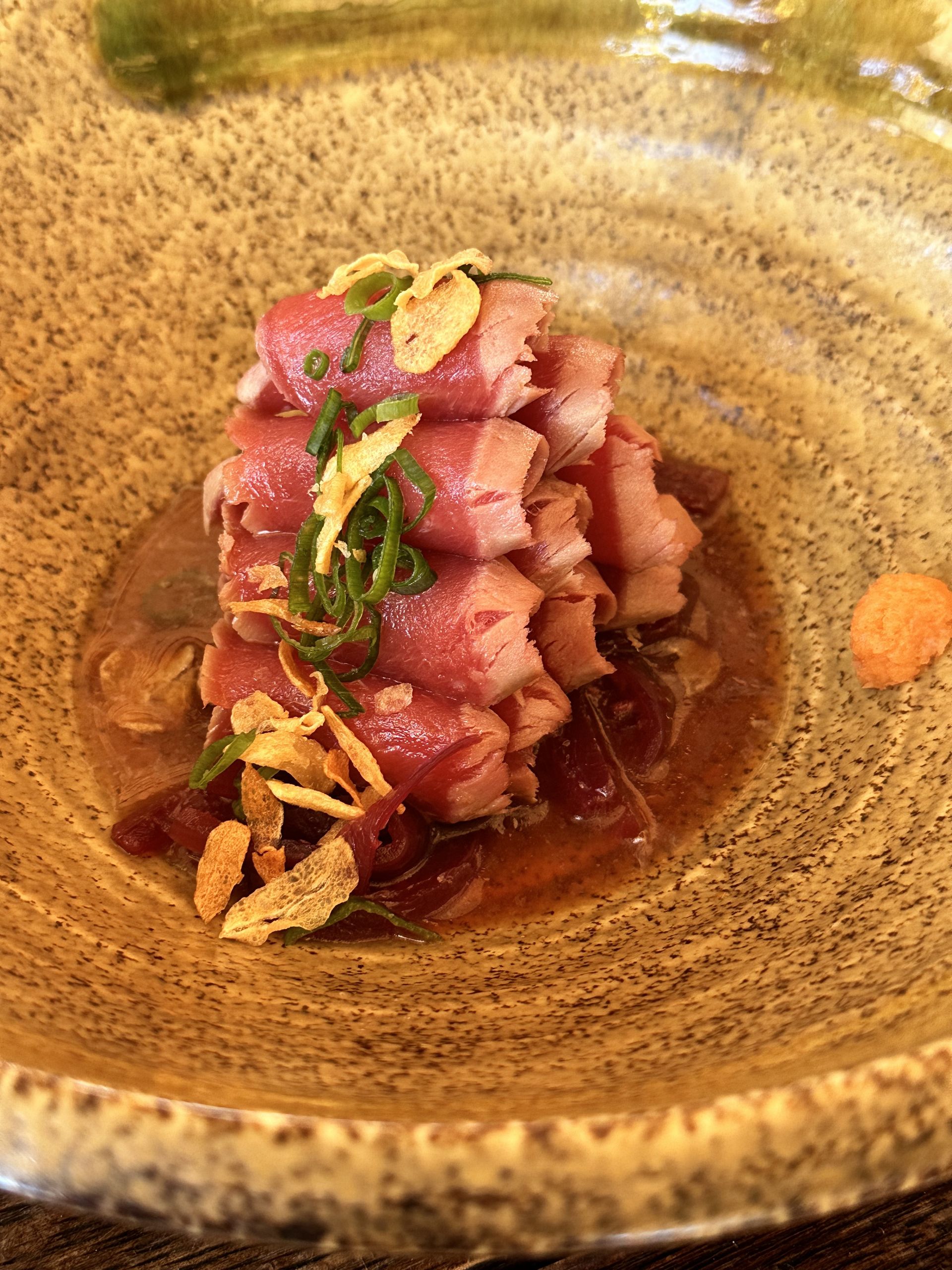 Espectacular chu toro con dashi ponzu, cilantro y sésamo, una de las partes grasas del atún y que se suaviza con la salsa.