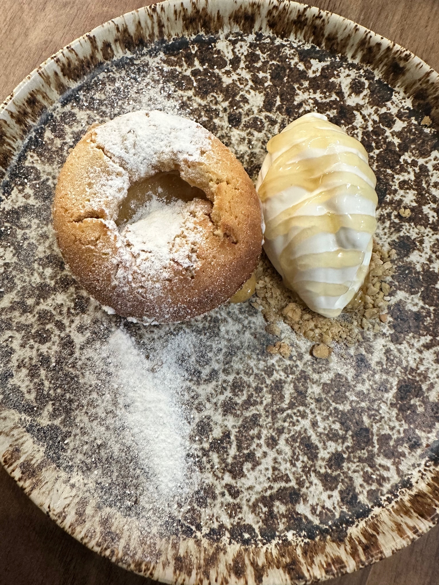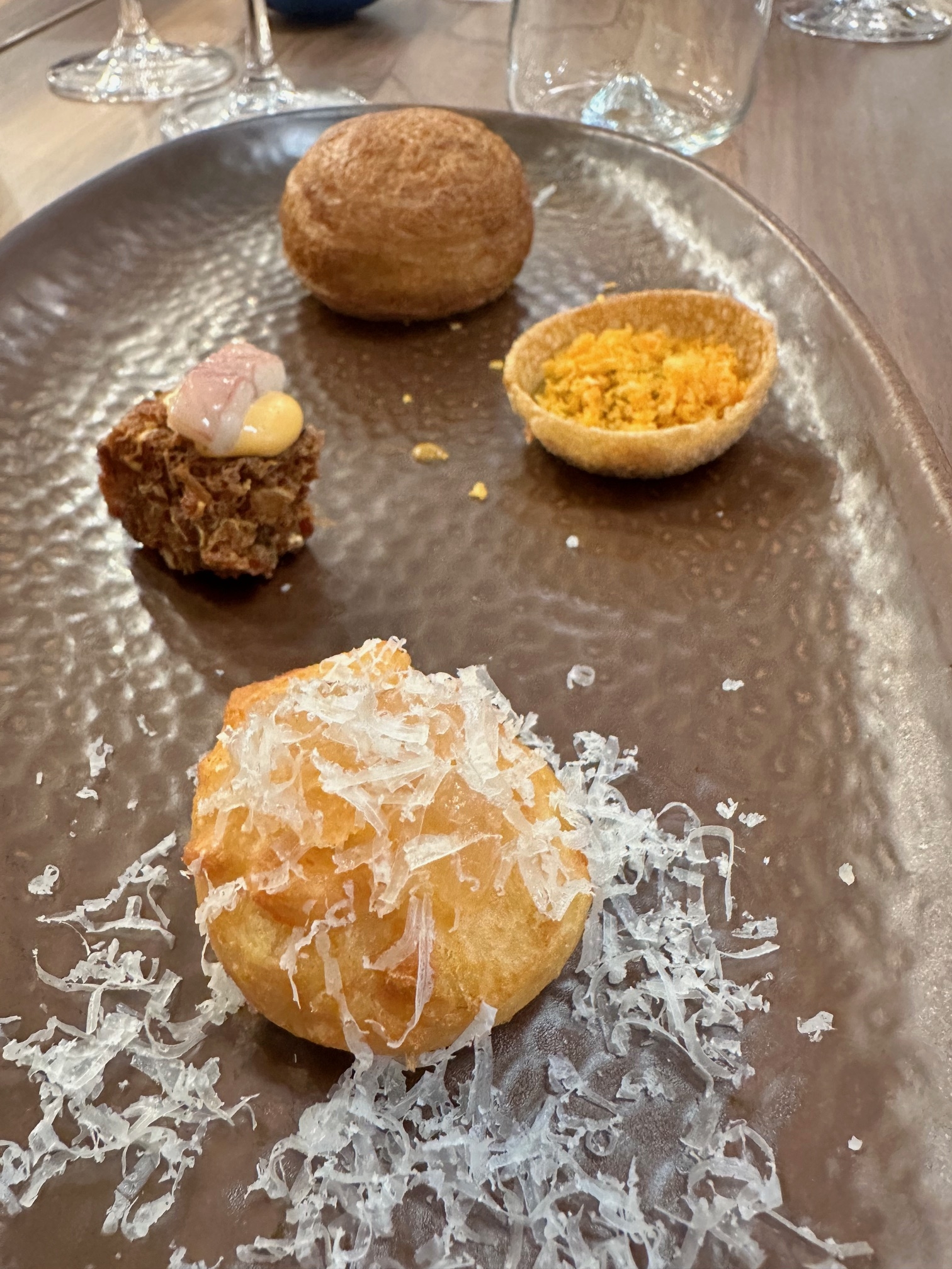 Los aperitivos de Eduardo Guerrero con un buen panipuri relleno de crema de lentejas (derecha). El siguiente aperitivo es sin duda el mejor de los cuatro. Un increíble crujiente de oreja de cerdo con mayonesa de kimchi y anguila ahumada (izquierda) para darle ese contraste de mar y montaña junto con un toque crunchy por fuera y meloso por dentro. Bueno también el buñuelo de queso manchego con una mermelada de cebolla (abajo) que está más fría que el buñuelo para darle es contraste de temperaturas y terminado con ralladura de parmesano. El pan chino relleno de mejillones (arriba), con una masa fina y esponjosa y un relleno con mucho sabor al molusco.