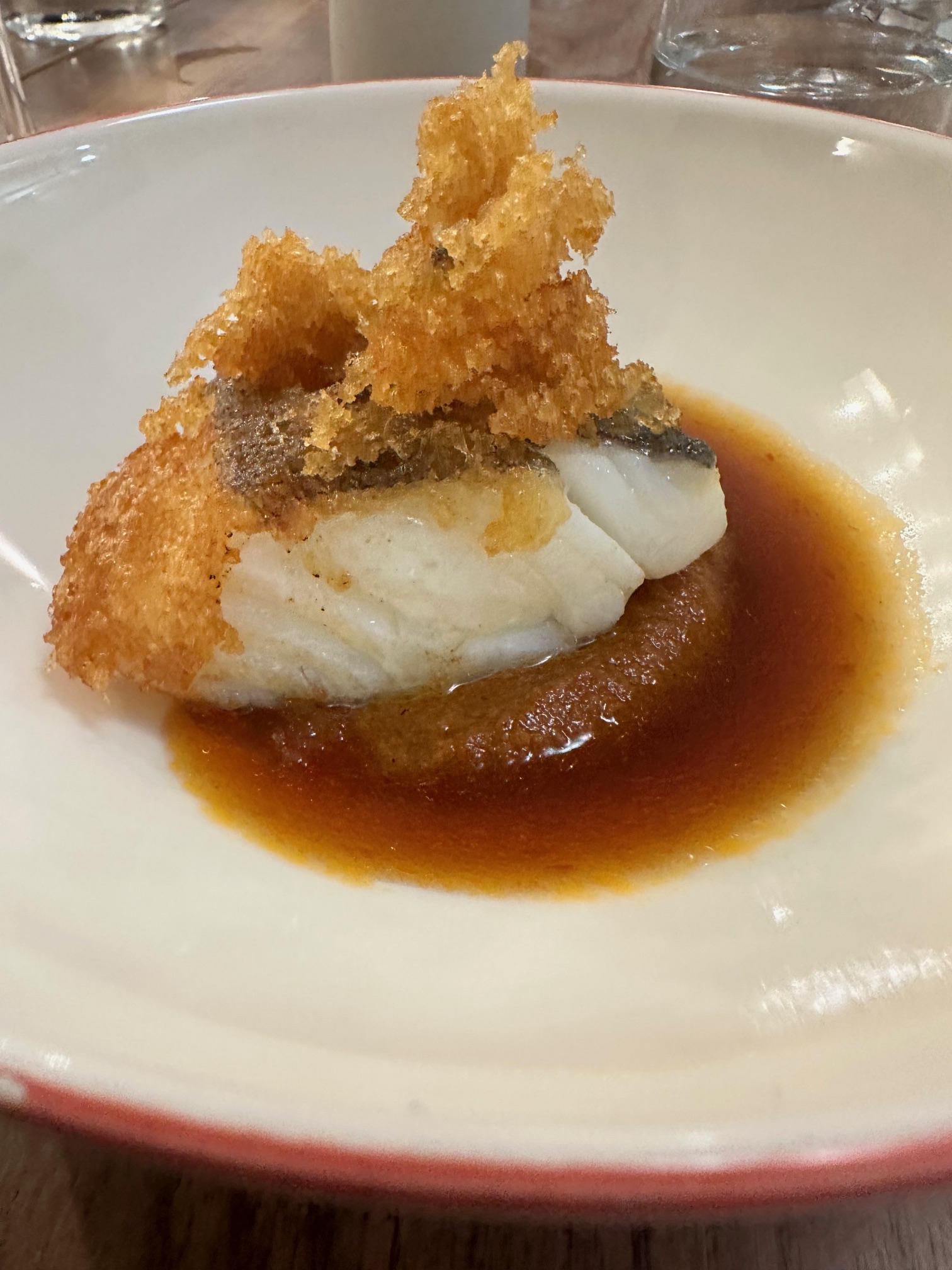 De Lucía Grávalos. Un maravilloso bacalao a la riojana, con una salsa tradicional en el fondo y un crujiente de pimiento riojano por encima que le dará ese contraste en boca con la singular textura de la carne de este pescado.