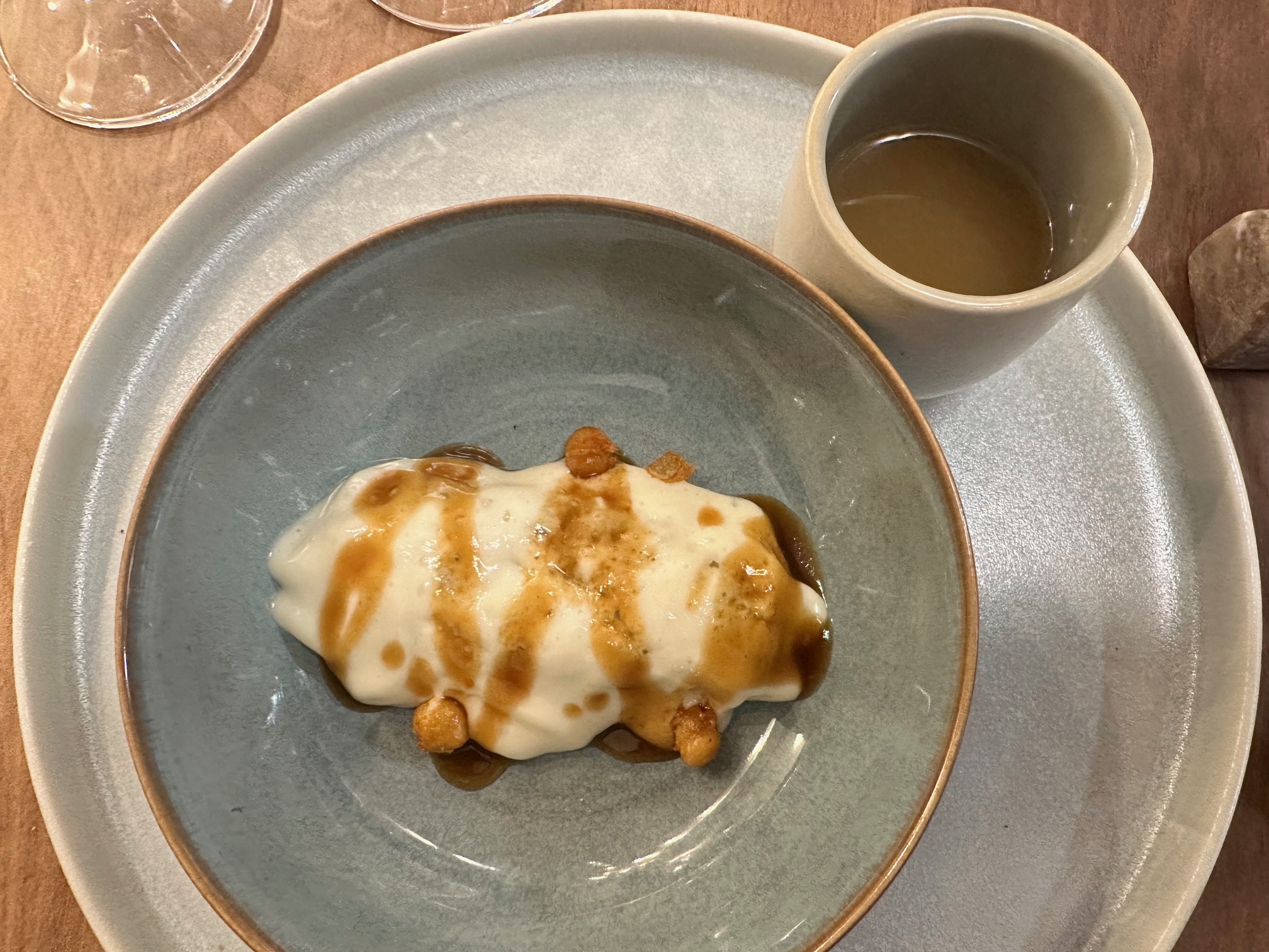 Eduardo Guerrero nos deleita con su ya famoso y espectacular canelón de cocido con su caldo. Lo hace con las carnes del cocido que sirven para rellenar la pasta wonton, que es más fina que la del canelón, y se termina con una velouté del caldo y una reducción del caldo de los huesos. Este plato va acompañado con un riquísimo caldo de cocido un poco trabado con garbanzos para darle más sabor.