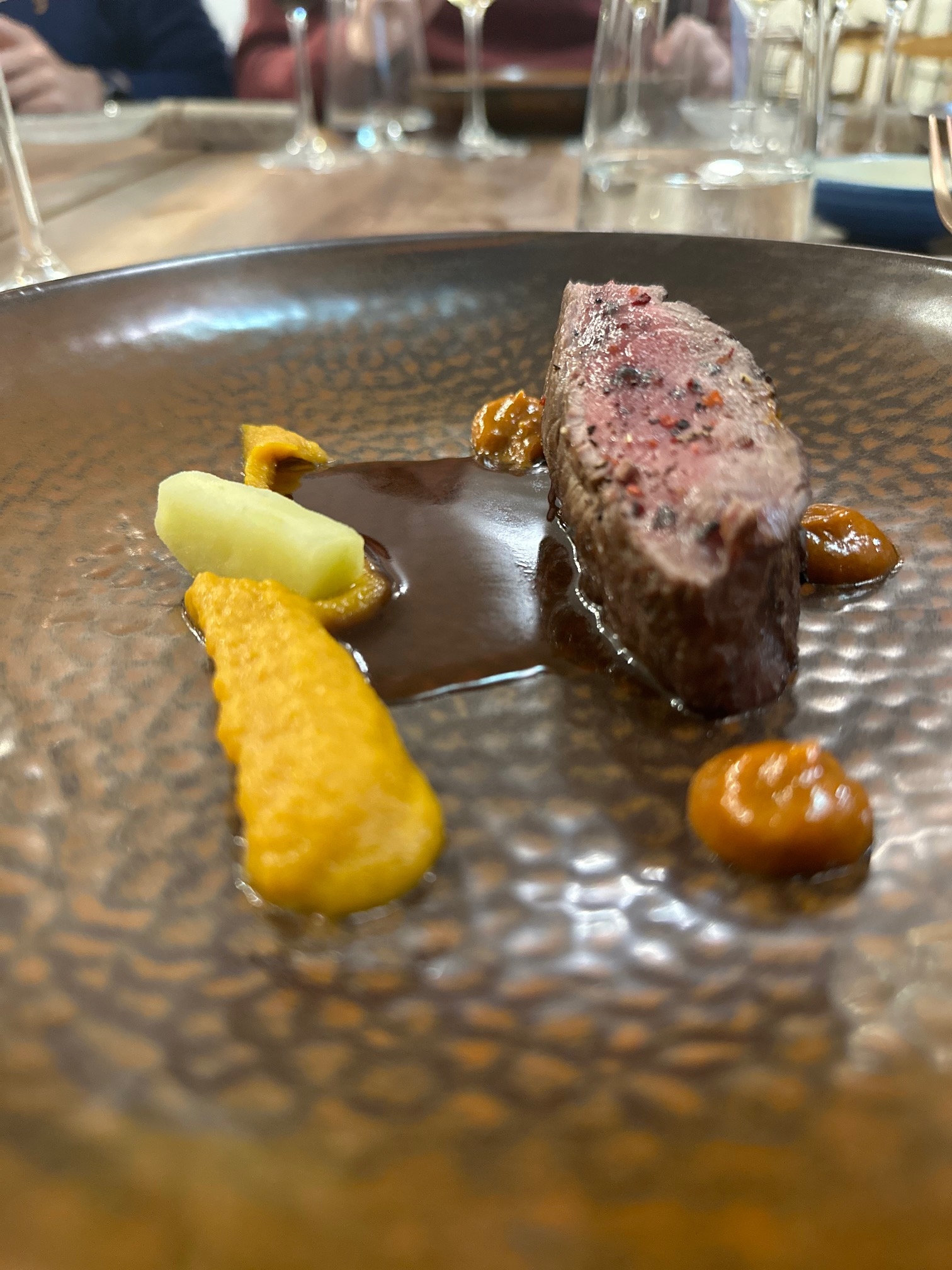 Eduardo Guerrero pone la carne con otro platazo como el ciervo con crema de calabaza. Hecho al carbón para que quede la carne en su punto y acompañado con una demi-glace de ciervo, crema de calabaza, manzana verde y un mojo que no pica.