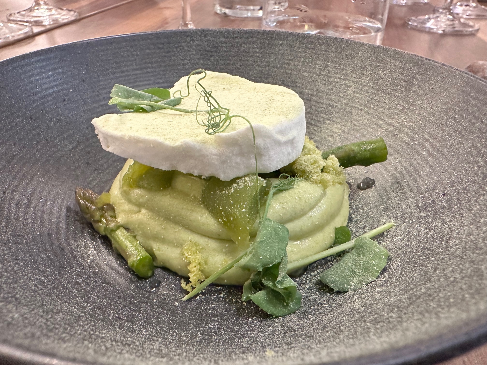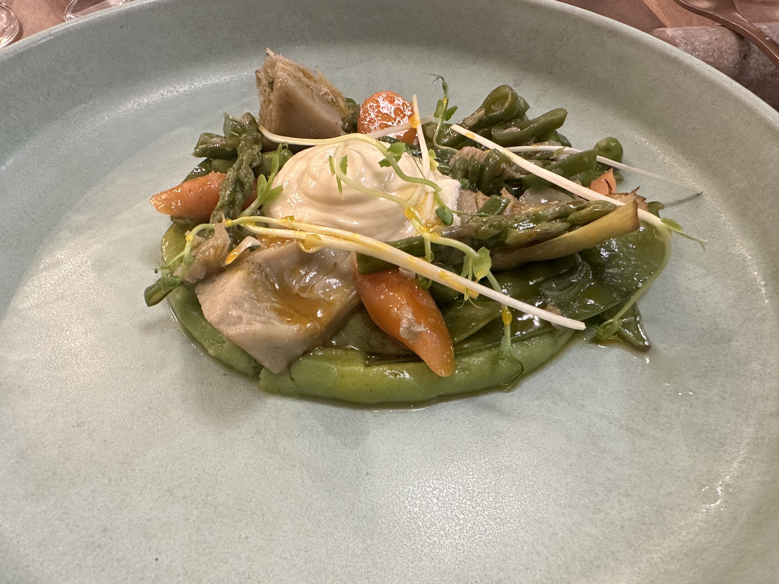 El amor de Lucía por las verduras de temporada también lo comprobamos con el segundo entrante de una menestra de temporada con espuma de ibéricos. En este mix de verduras encontramos, entre otras, trigueros, alcachofas, zanahoria baby y se emplata con una espuma muy sutil de ibéricos en el fondo, acompañada con una yema de huevo que curan en un caldo de verduras un poco fermentado.