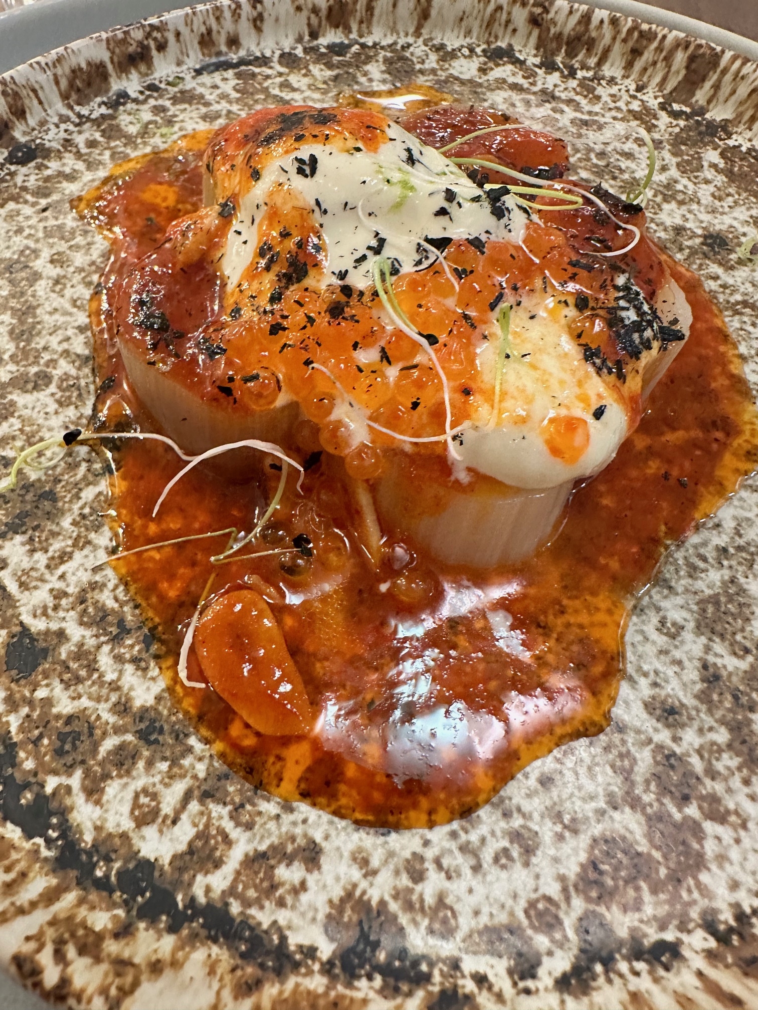 De los dos primeros entrantes se encarga Lucía. El primero, uno de los platazos del menú en el que se conjugan sabores, texturas y fermentaciones para elaborar unos puerros en vinagreta del norte con quesos riojanos. Esta ensalada está integrada con puerros en vinagreta con un toque de lima, con un salmón marinado en el fondeo del plato, una vizcaína versionada con un kimchi de acelga (que nos cuenta que lo encontraremos en Desborre) y que lleva una fermentación de un mes y medio pero que va a ir avanzando. Nos cuenta la chef calagurritana que para elaborar este plato ha partido de la receta base de su abuela de una vizcaína moderada, una crema con una selección de quesos de La Rioja con un pelín de Idiazábal para darle ese toque ahumado y terminado con unas huevas de trucha.