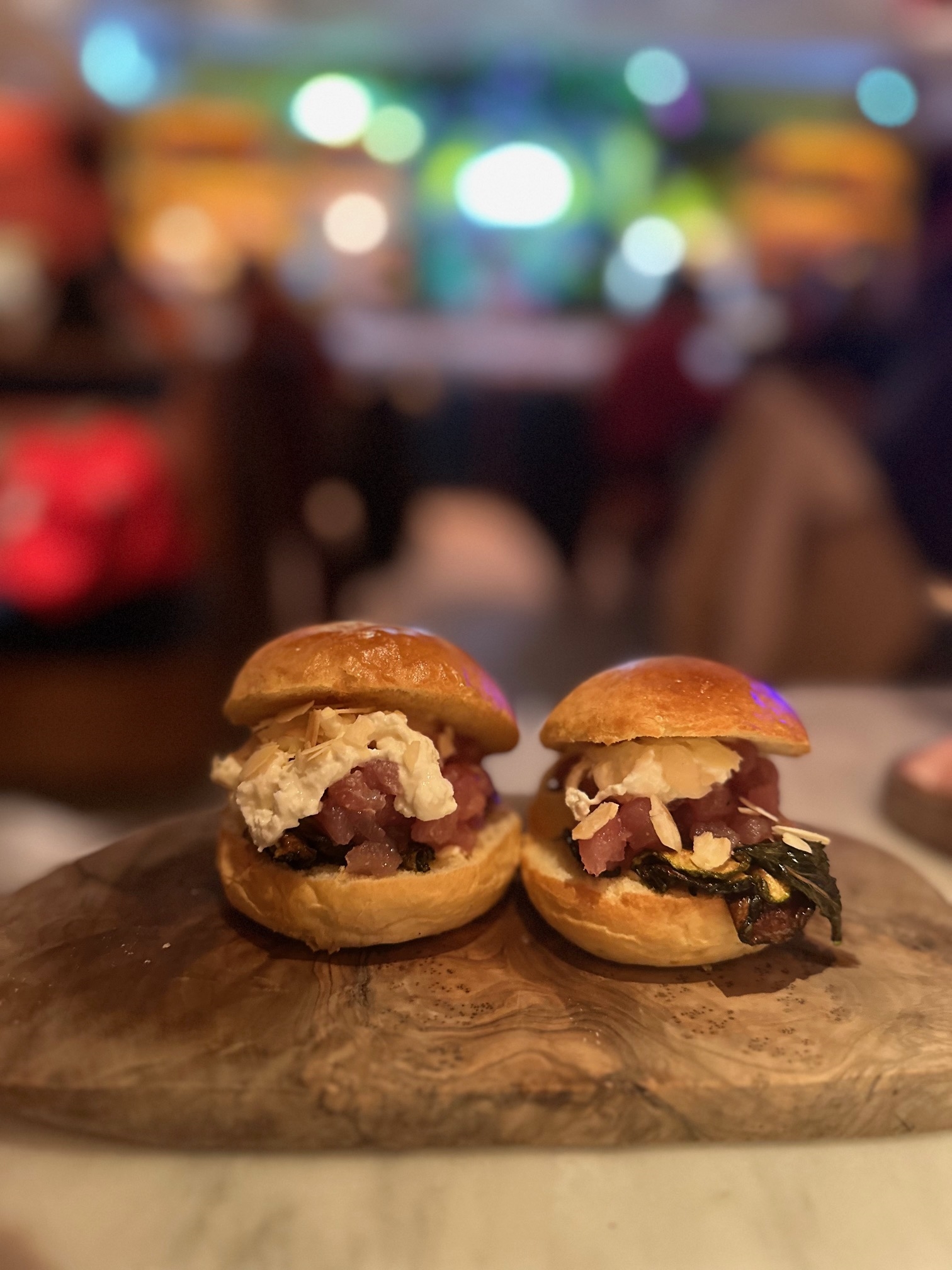 Attuna matata, unos brioches de tartar de atún, stracciatella de Puglia, calabacín alla scapece Napoletana y almendras tostadas. Un buen bocado aunque se agradecería que el brioche estuviera más esponjoso y no tan seco.