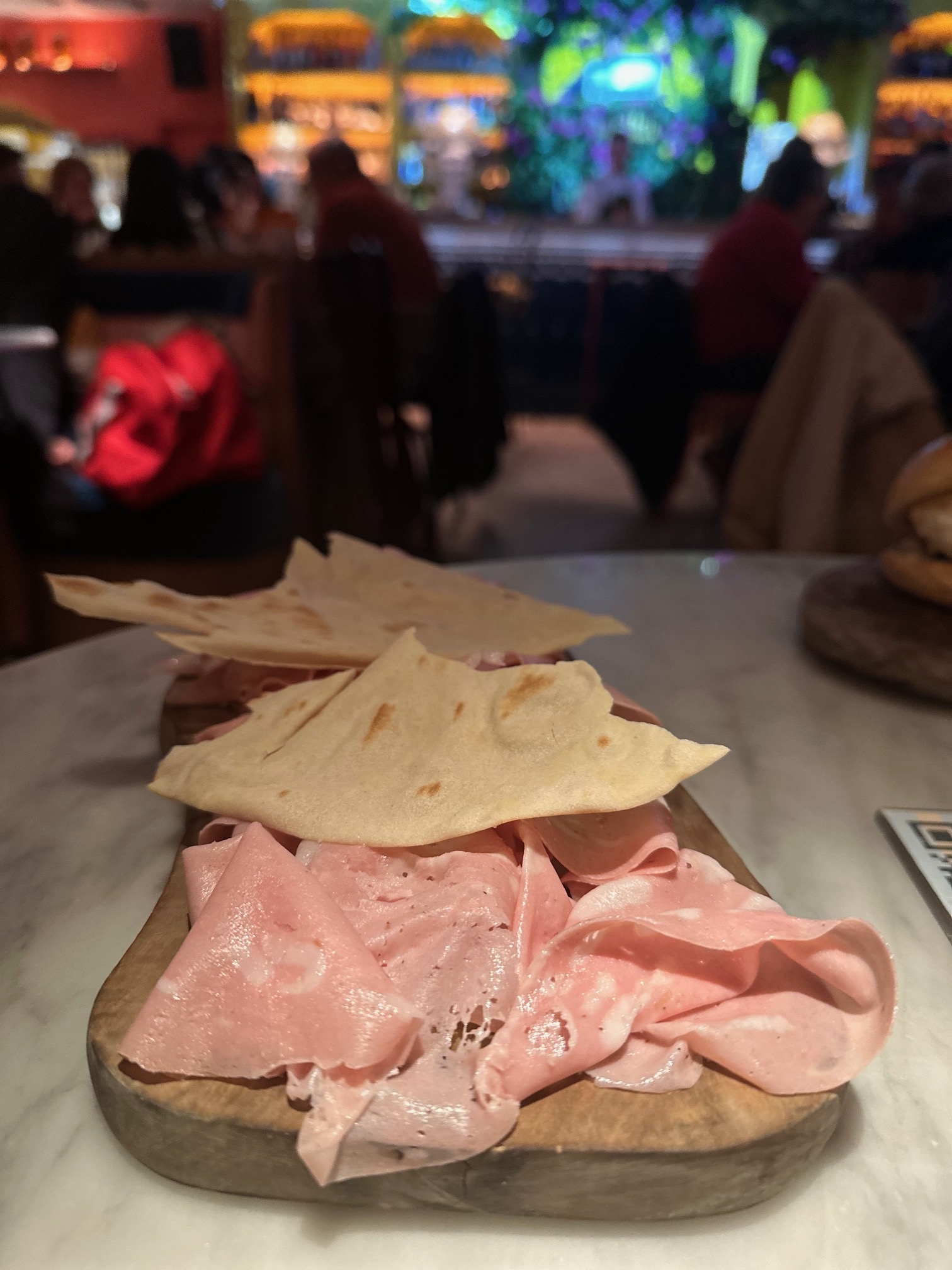 De los entrantes para compartir disfrutamos con una buenísima mortadella a la trufa.