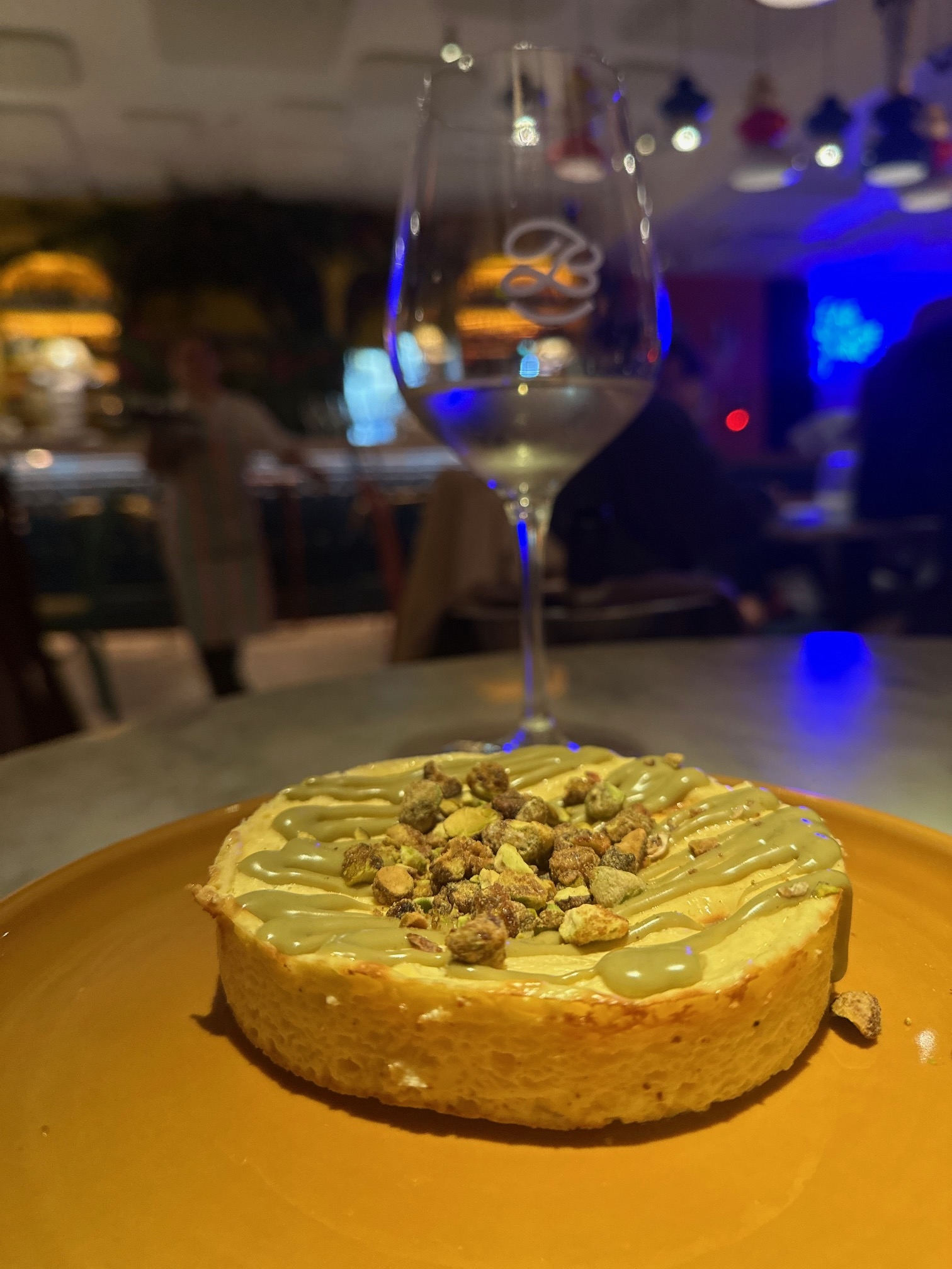Para terminar, la quesomanía, una muy buena tarta de queso cremosa, con pistacho de Bronte.