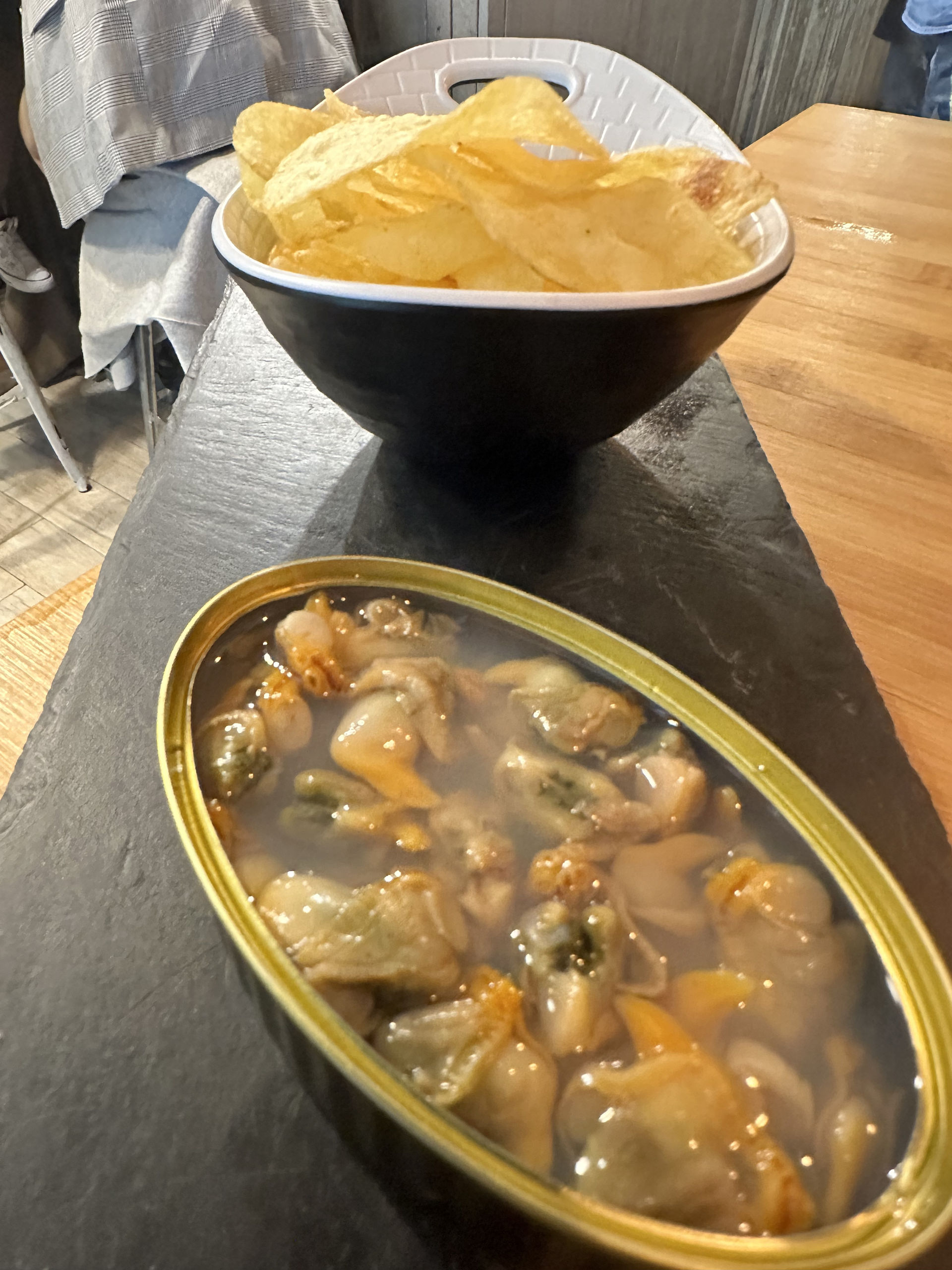 También tiene su pequeño apartado de "laterío", pero de calidad como la magnífica lata de berberechos "La Florita", de muy buen tamaño y sabor y con sus patatas fritas correspondientes.