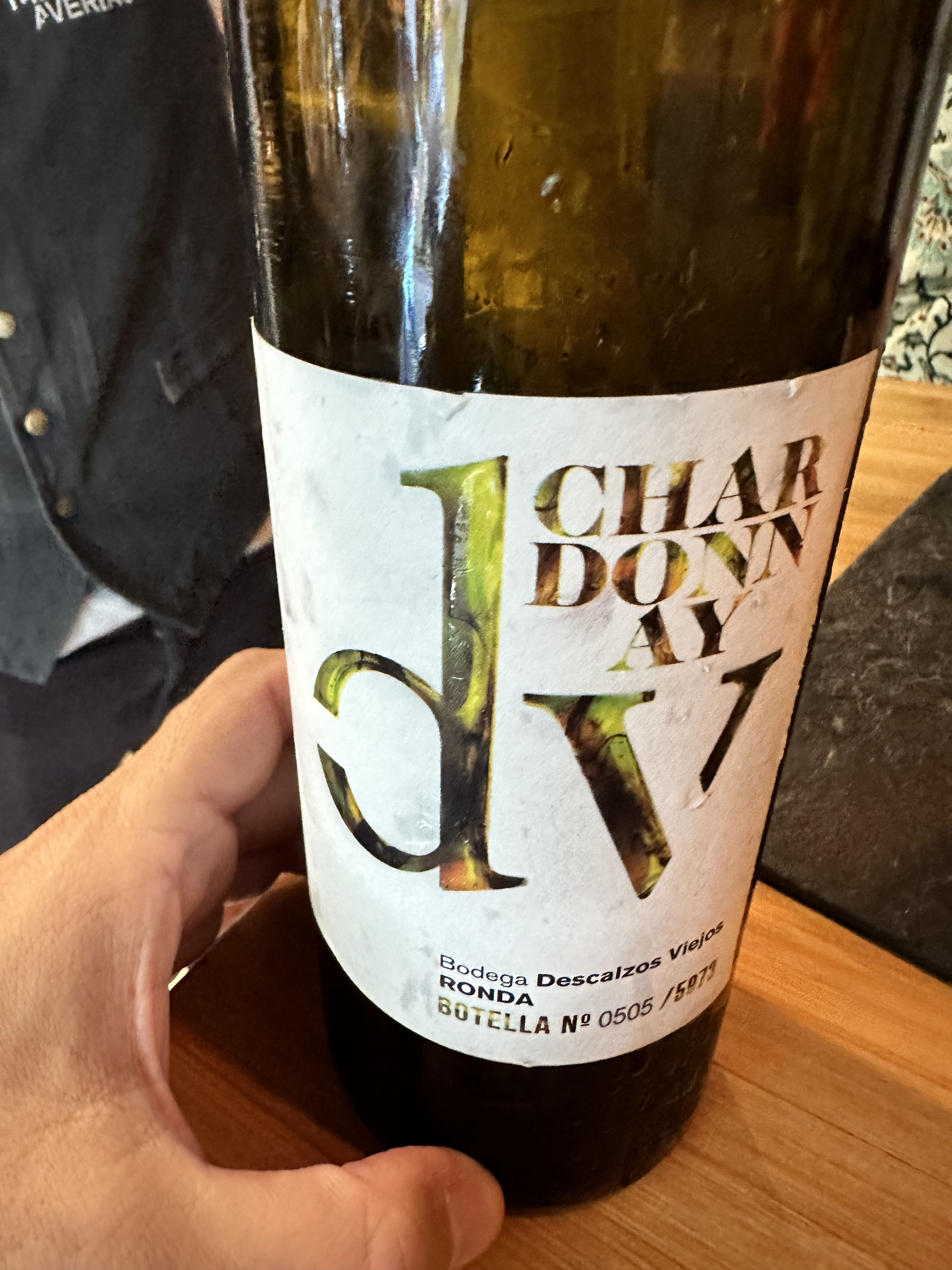 Vino blanco DV Chardonnay, de la finca Descalzos Viejos, de Ronda que es una edición limitada de la que probamos la botella nº 0505 de 5.973. Un caldo de color amarillo con toques dorados y sabor fresco con final intenso.