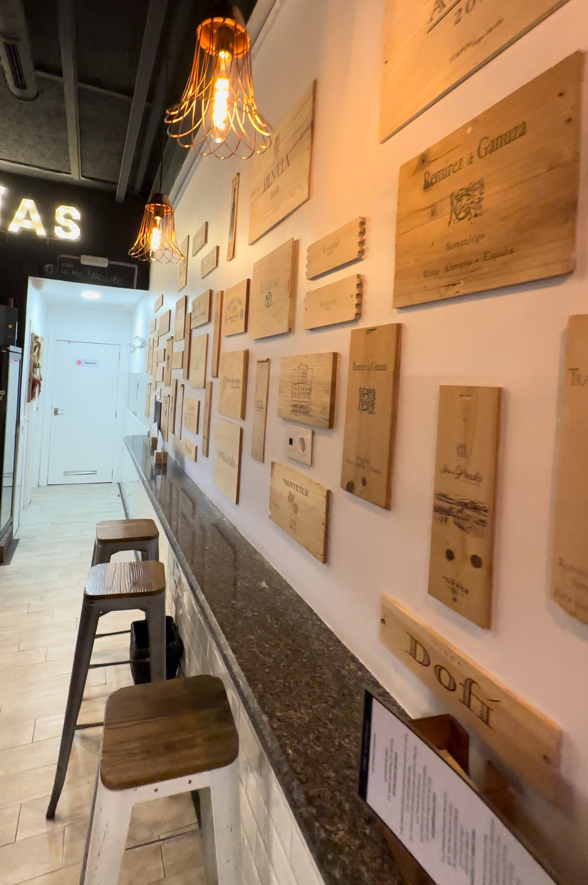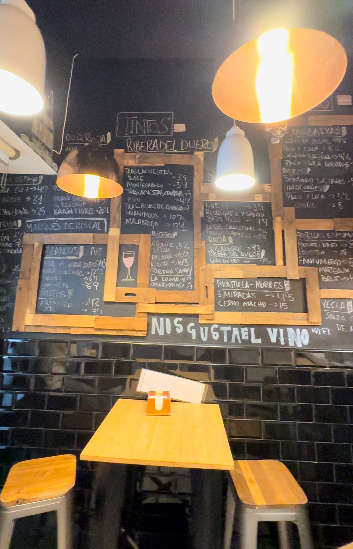 En la otra pared, pizarras con los precios de distintos vinos separados por zona o DO.