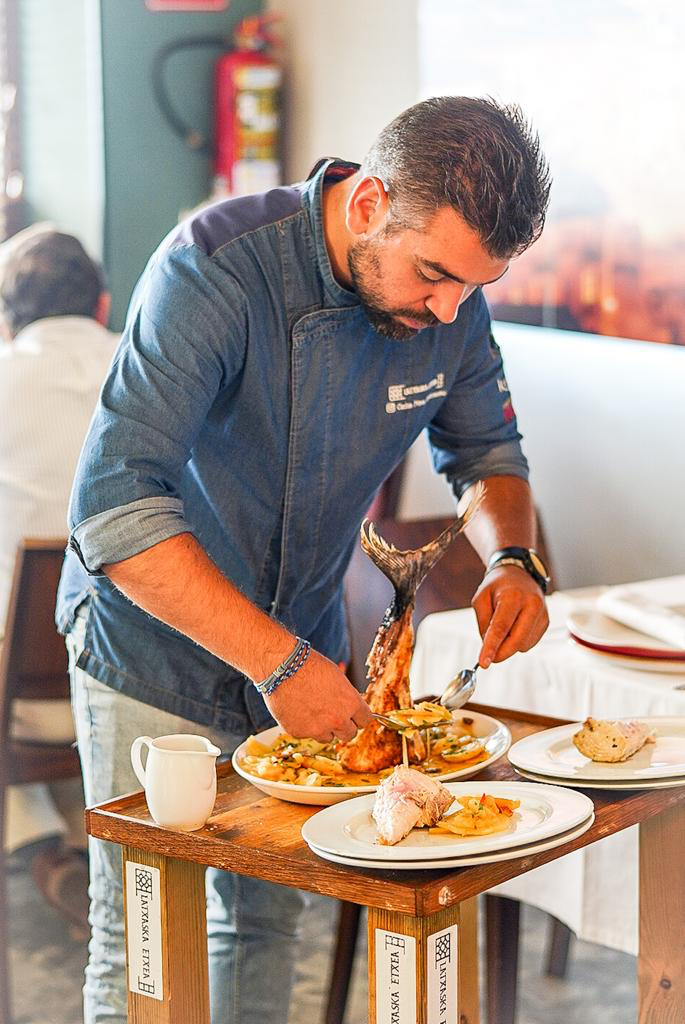 En servicio en sala es fundamental en Latxaska Etxea y hay varios platos que terminan de servirlos a la vista del comensal.