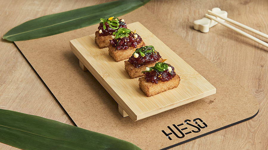 En Hueso vas a ver esa cocina viajera, así que te recomiendo probar el sabrosísimo saam de cabracho en sisho con salsa tártara asiática (8€). Un delicioso bocado que preparan sobre una hoja de sisho, que aporta el toque cítrico, un cabracho cocinado a baja temperatura y pasado por parrilla, con una vinagreta de miso, una salsa tártara asiática y por encima huricate. recomendamos cerrarlo y comerlo con la mano. Plato típico coreano versionado.