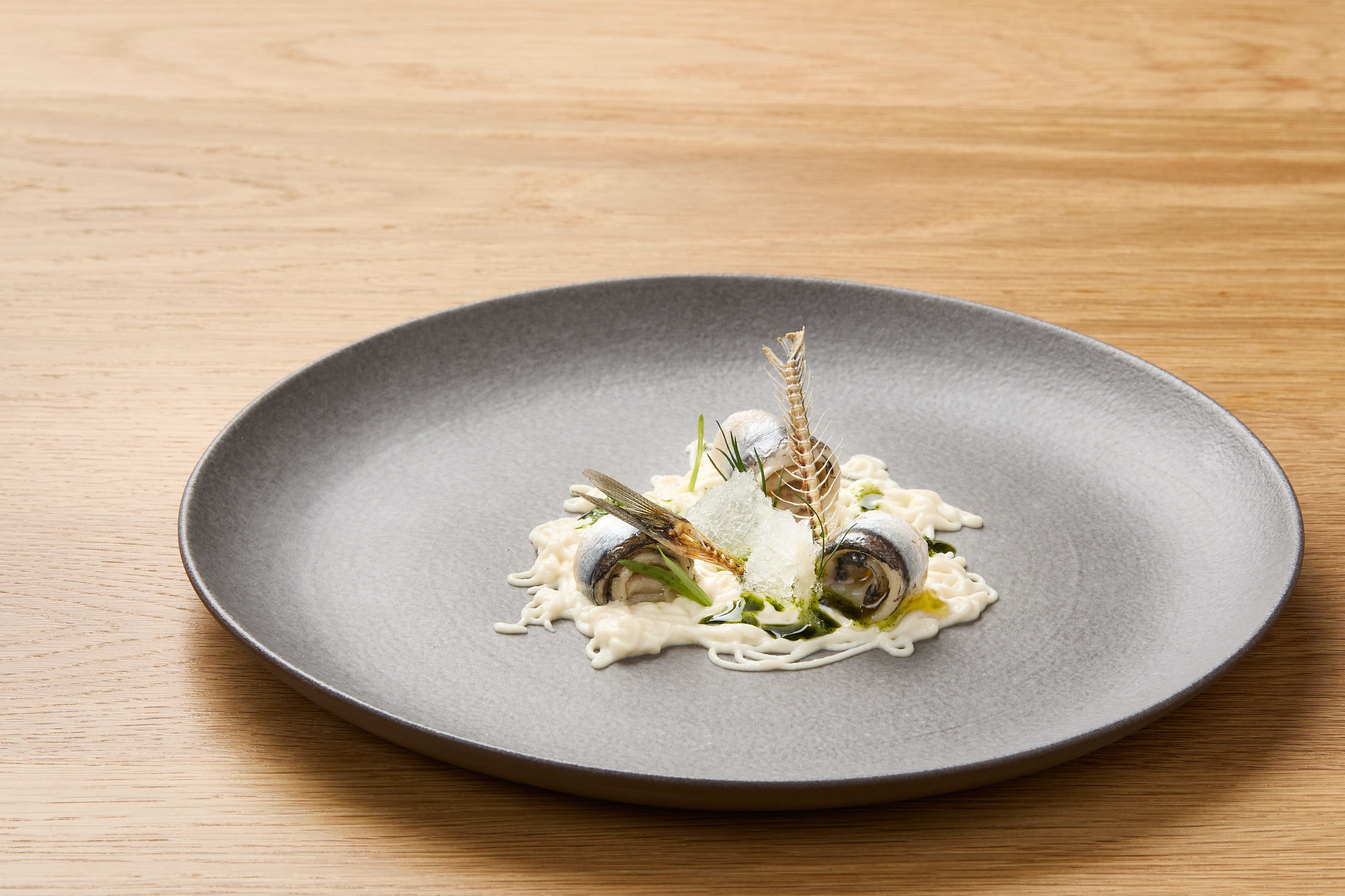 Ya sentados en la mesa, el menú propiamente dicho comienza por el Territorio, con estos deliciosos boquerones en vinagre con almendra y hierbas.
