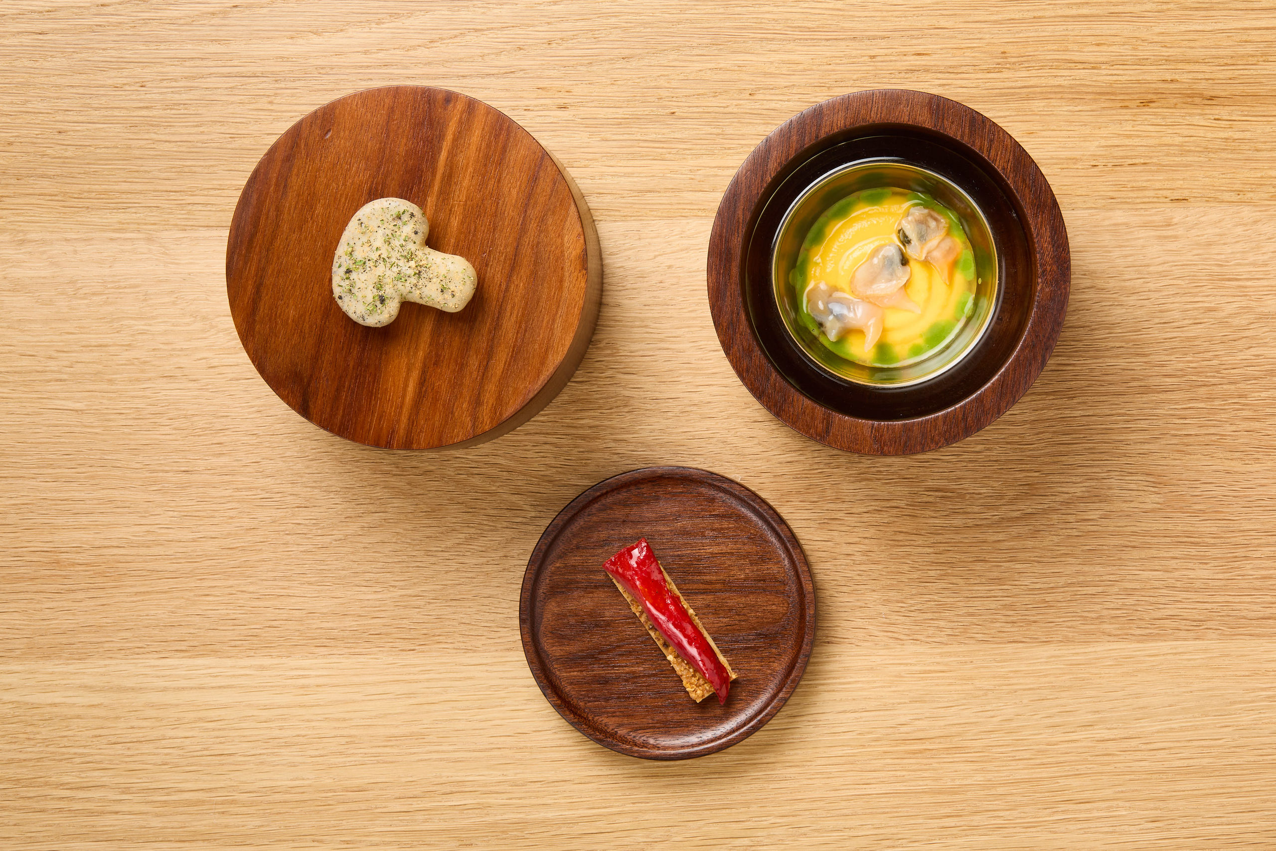 Champi y gamba; berberechos y zanahoria; y pimiento choricero y crocante de maíz, el mejor de los apertivos.