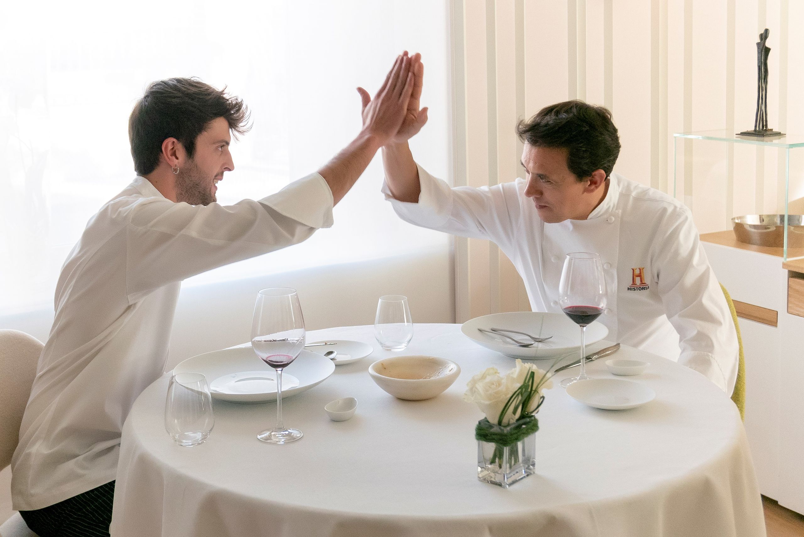 Francis Paniego choca la mano con Pol Contreras, cocinero y pastelero que ha creado su propia línea de chocolates artesanos y al mismo tiempo es el responsable de la parte dulce de Echaurren.