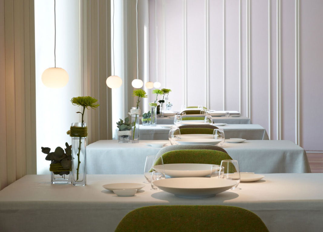 La decoración de El Portal es minimalista, con predominio del blanco y las sillas tapizadas en verde, blanco y mostaza aportan un toque de color al restaurante.