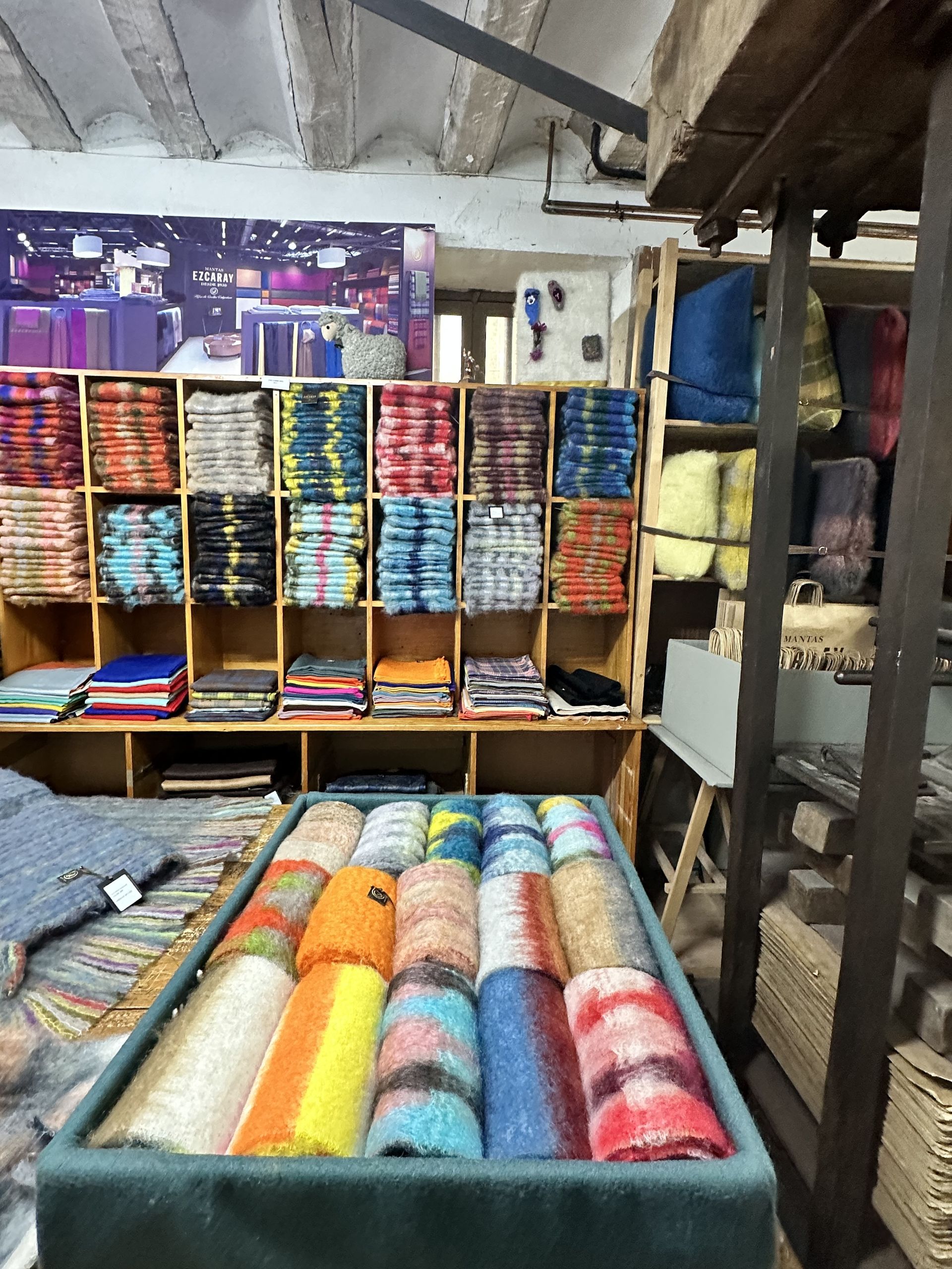 Las mantas de Ezcaray las puedes gozar en las habitaciones del hotel y comprar en la tienda del pueblo. En esta habitación tienes la preciosa vista de la imponente Iglesia de Santa María la Mayor.