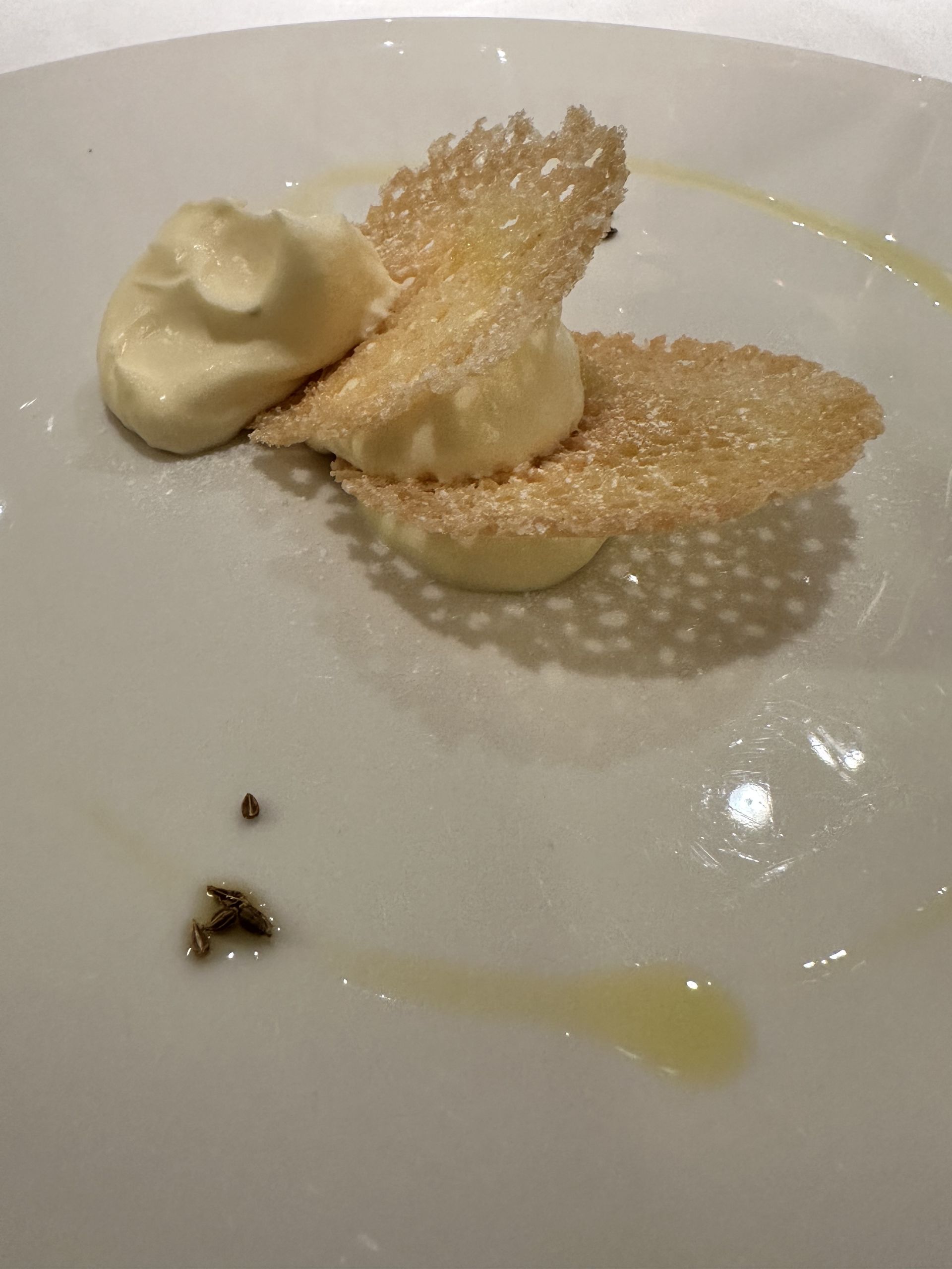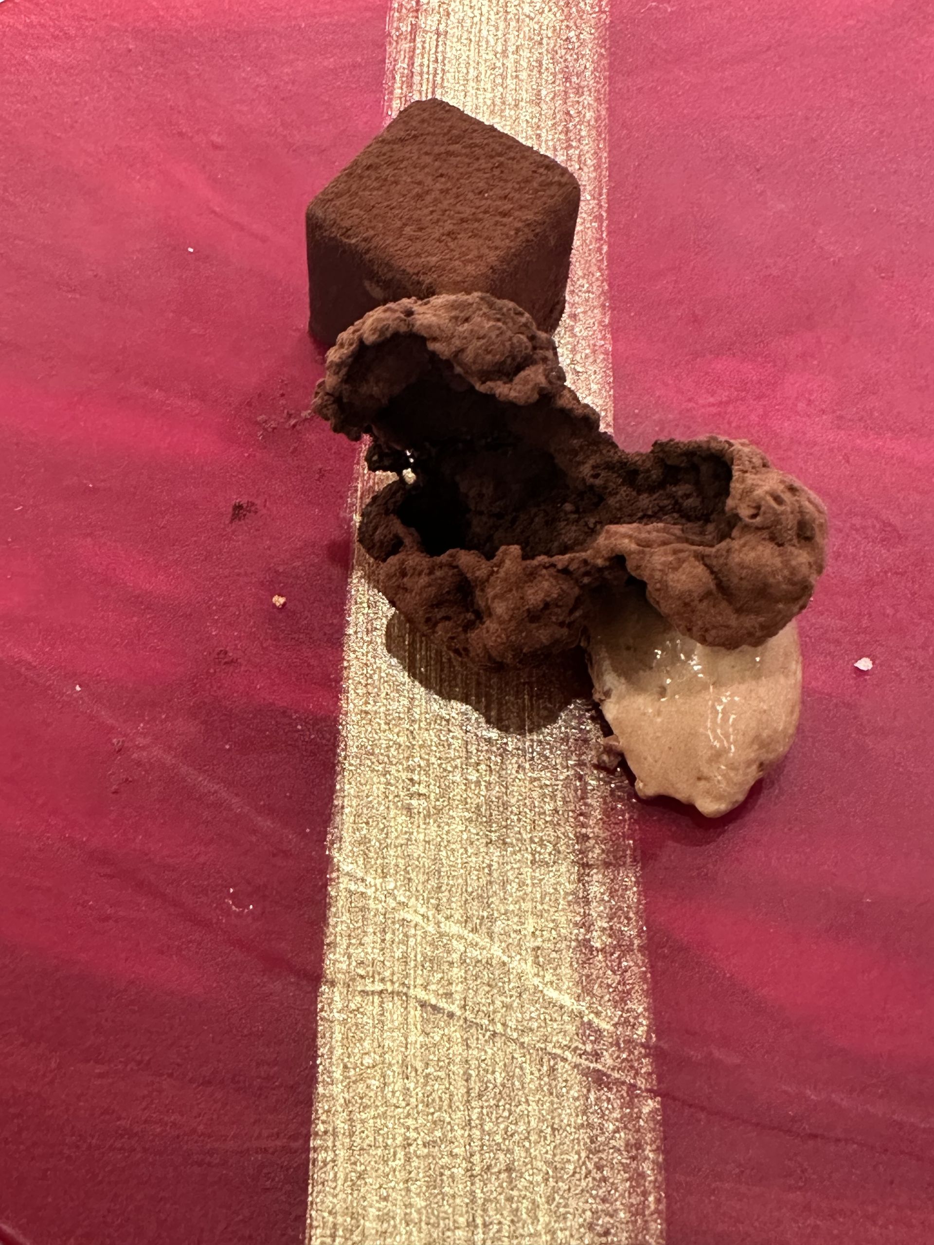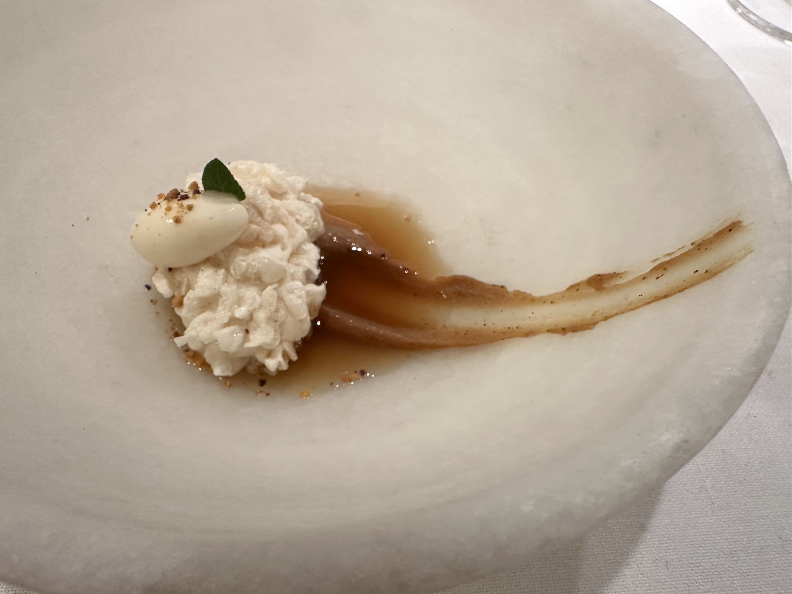 Precisamente con Juego, Paniego echa una vista atrás hasta la infancia en forma de buenísimos postres y en los que también se liga con la casquería: helado de mantecado envuelto en cortezas.