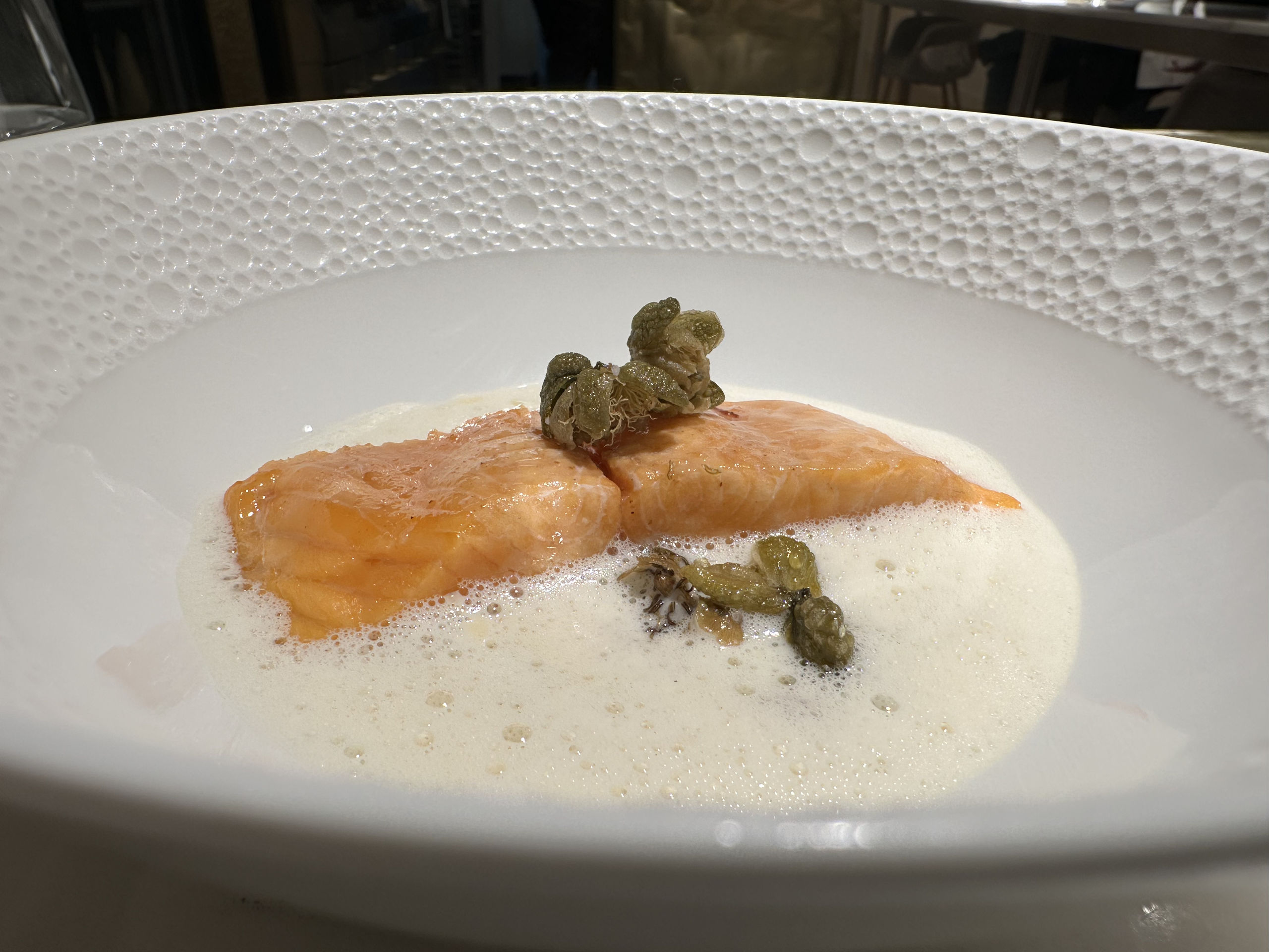 Cada plato presentado en el menú tiene una estudiada presentación y los colores típicos del otoño, con los ocres y marrones. Y también alguna nota que sobresale como en el caso de la trucha con pepinillo, tallo wasabi, mostaza, alcaparra y sopa de hoja wasabi. En la base tenemos un picadillo de takuan –que es un encurtido japonés– y pepinillo. Lo acompaña de una picada de bacon y con una salsa de soja blanca, tamari y sake, lo termina con las alcaparras fritas. La trucha que tiene un punto perfecto, la hace horneada y con el toque maravilloso al untarla en grasa de papada ibérica.
