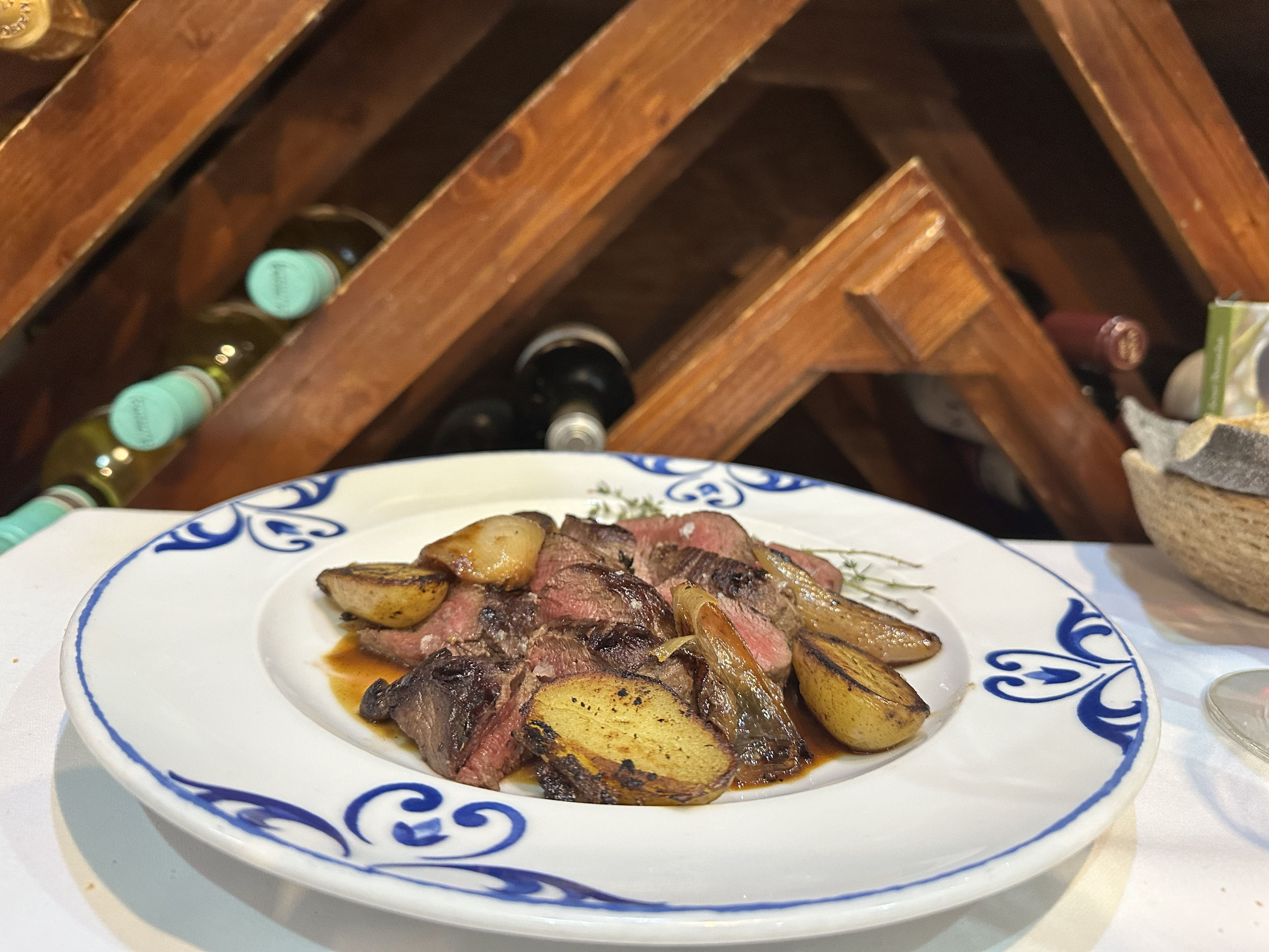 También se borda la caza en esta casa, como con el ciervo con cebolla y patatas (37€) que nos recomienda Trifón y de nuevo un plato con un intenso sabor, con la carne en el punto perfecto para que se deshaga en la boca y con el toque dulzón que le aporta la cebolla y con unas patatas asadas que acompañan cada bocado. Para terminar este festival culinario, una muy buena tarta de queso (8€) con un peculiar toque de aceitunas negras.