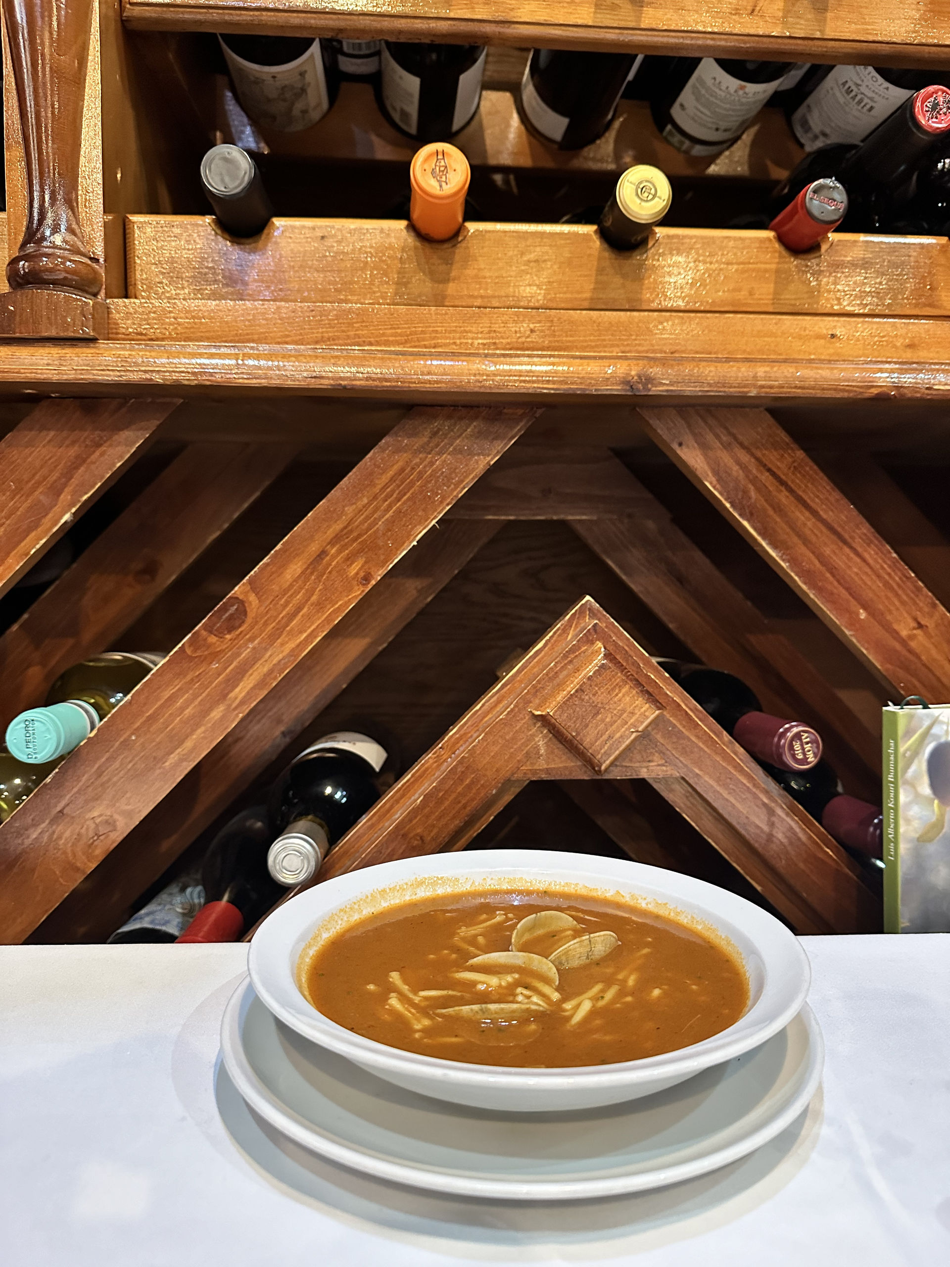 Precisamente el guiso del día son unos extraordinarios fideos con almejas (22€), un platazo con un sabor y un fondo que revela el trabajo a fuego lento que lleva detrás. Con una base de verduras como pimiento, tomate, zanahoria, que las dejas pochar hasta que quedan caramelizadas y deshidratada, se le añade para aportar melosidad a la salsa pan fritomojado con cognac o vino blanco y flambeado para quitarle el alcohol. Además, el fumet de pescado con cangrejo machacado, triturado y colado para que quede ese bisqué de marisco.