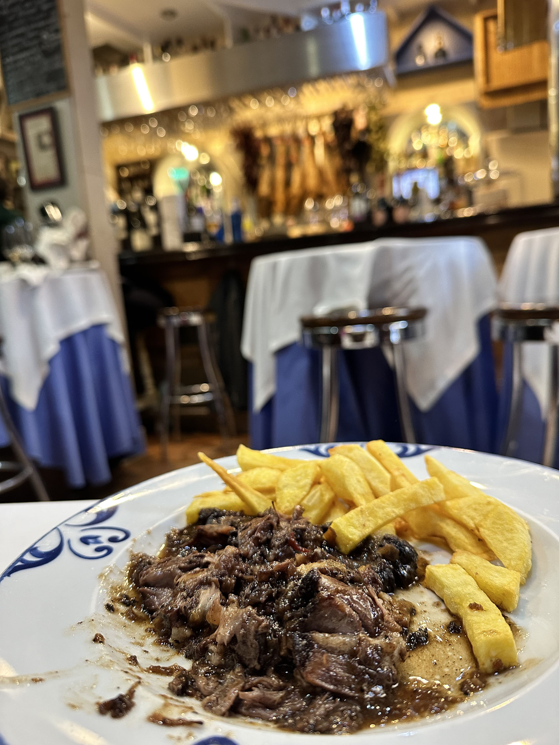 Con tan buen producto lo mejor es seguir probando las elaboraciones de El Fogón de Trifón. Como su espectacular rabo de toro con patatas fritas (M 21€ / E 26€). Reconoce que el secreto, además de una buena materia prima, es el vino tinto que le echa al guiso, un líquido que se lo sirven unos amigos y que probamos en copa para comprobar su buen sabor. Del rabo de toro he de decir que es uno de los mejores que he comido, con la carne en su punto exacto y que el propio Trifón te lo desmiga para que lo puedas disfrutar en su totalidad acompañándolo de unas buenísimas patatas fritas. La salsa también tiene esa melosidad propia de la gelatina que suelta durante la cocción el propio rabo.