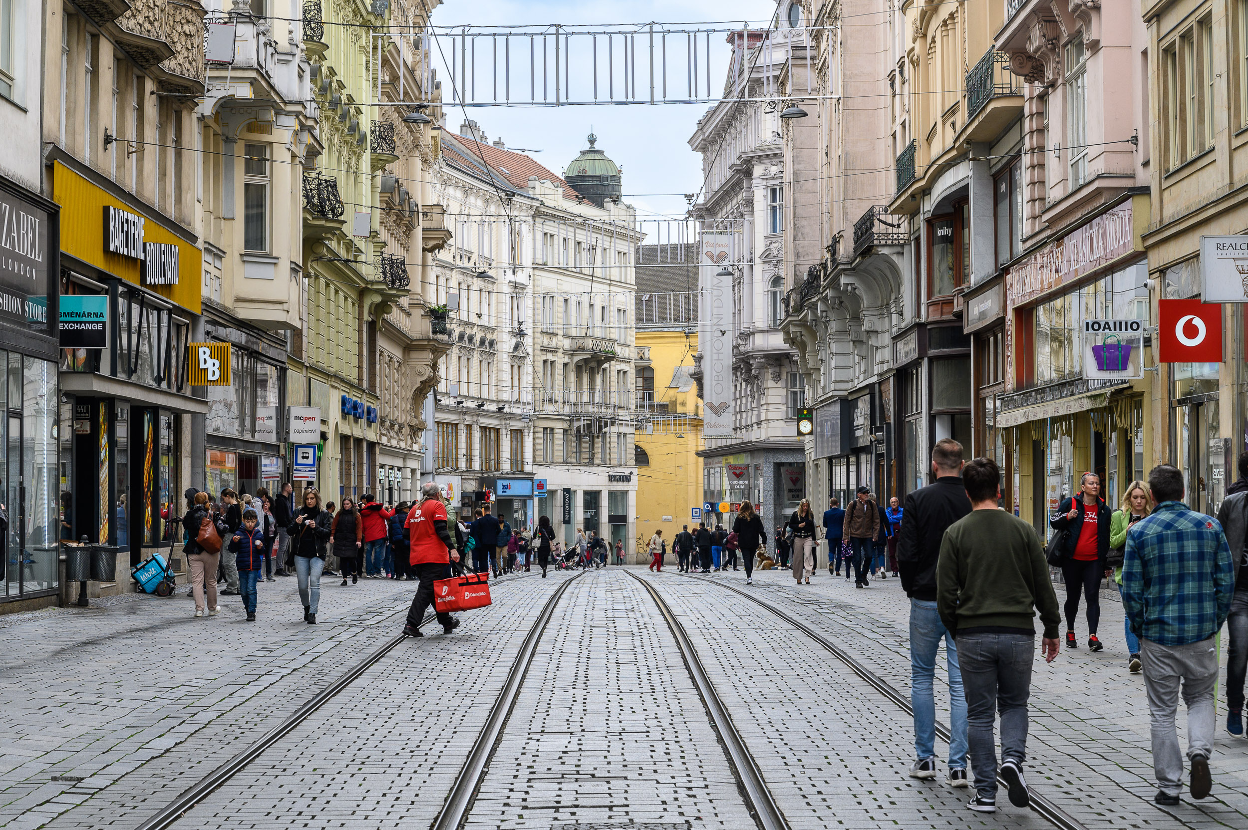 Una de las calles comerciales en el centro de la ciudad de Brno.