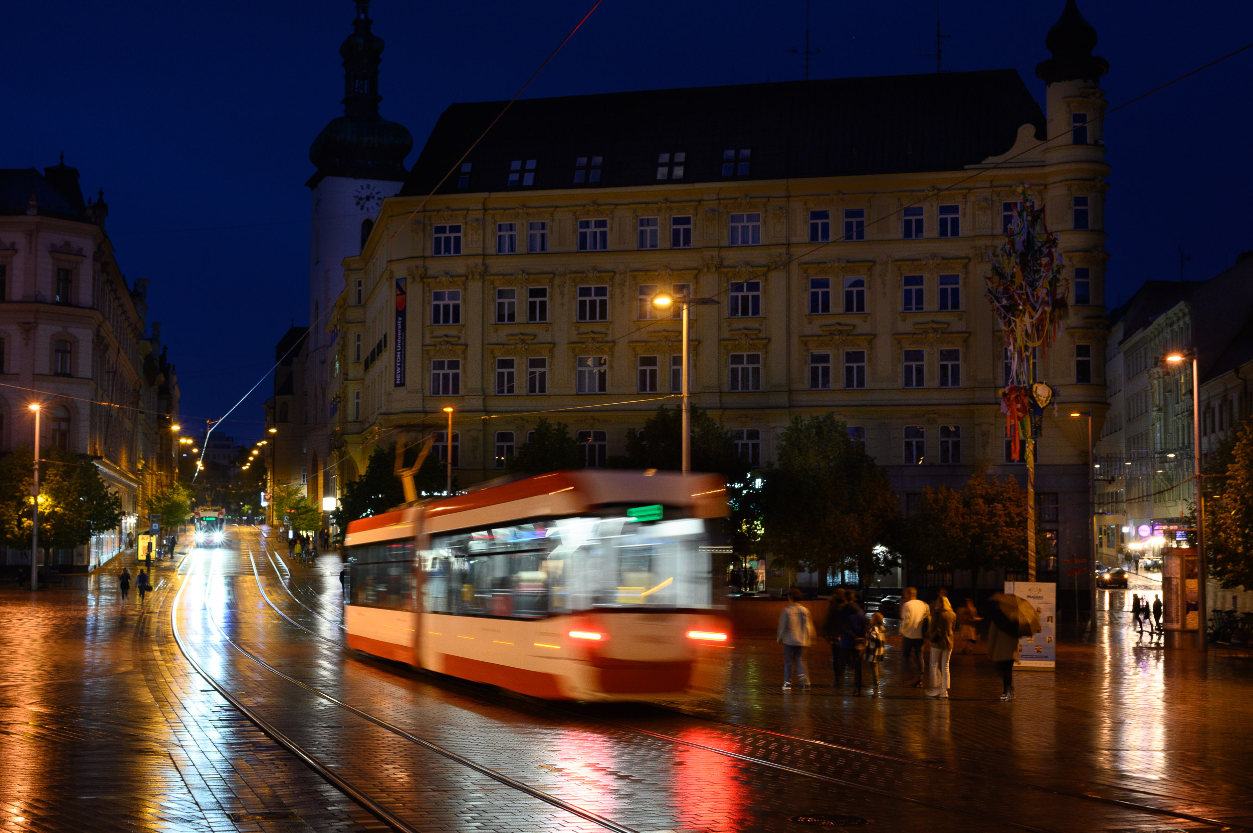 El tranvía nocturno atraviesa una de las plazas principales del centro de Brno.