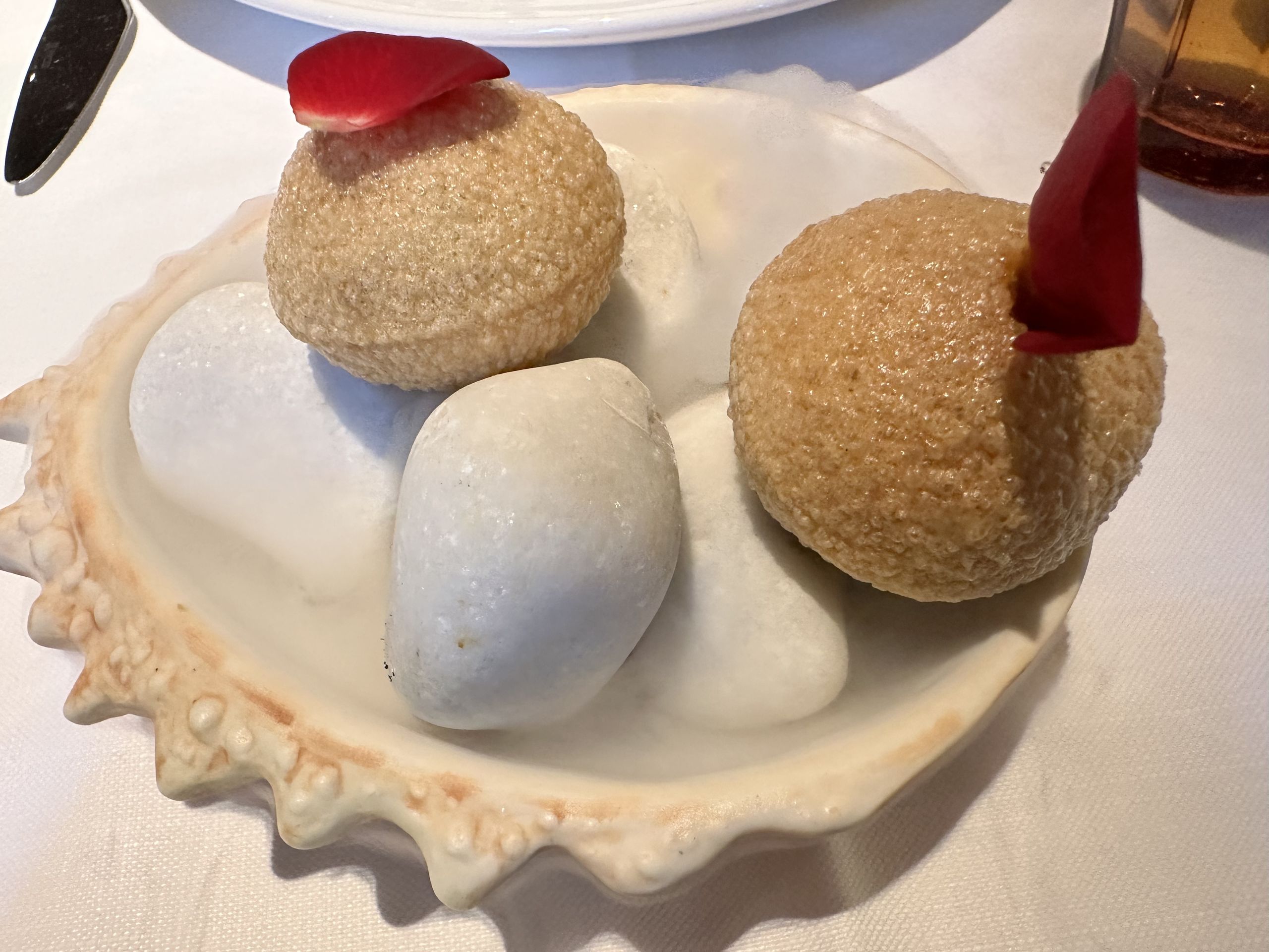 Relleno de sabor llega un increíble bombón de txangurro, que te lo tienes que meter entero en la boca para que el panipuri cruja y desprenda todo el relleno del preparado de centollo que llenará tu paladar de sabor a mar. Además, el plato te lo terminan en la mesa con el hielo seco que desprende ese humo tan visual.