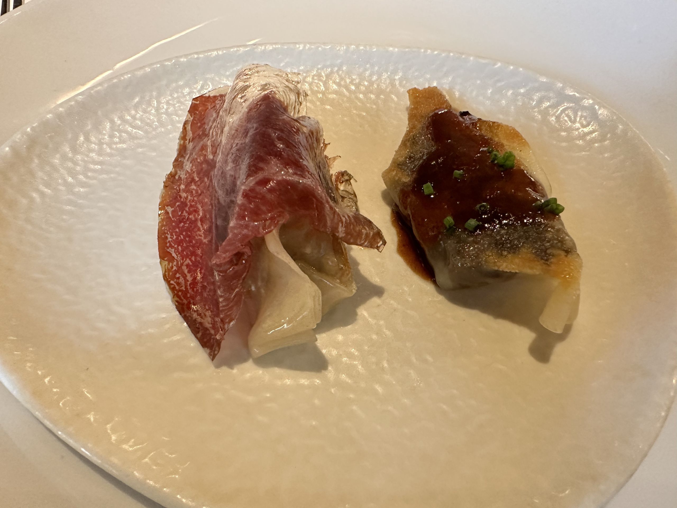 Fantásticas gyozas que nos sacan también fuera de carta, una rellena de boloñesa de vaca madurada con velo de cecina y la otra de rabo de buey.