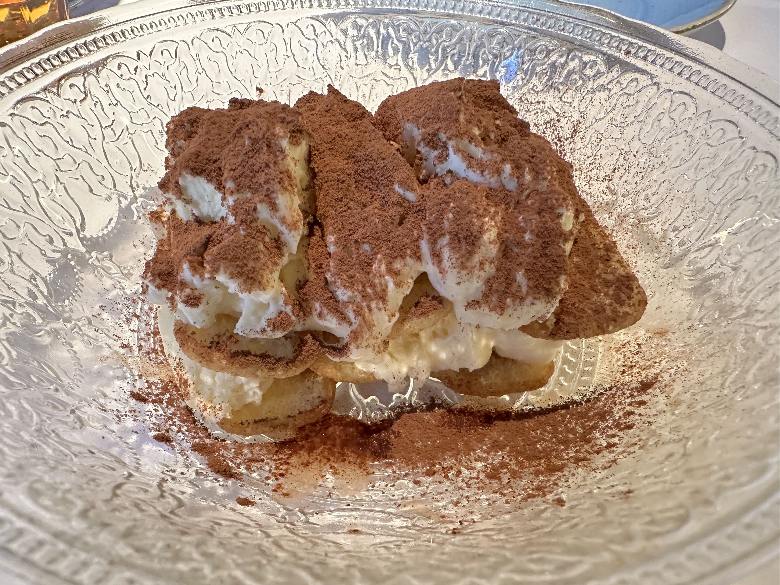 Como punto final, un rico tiramisú que se prepara íntegramente en la mesa. En la base pone el bizcocho Pavesini mojado ligeramente con café descafeinado para que no amargue y un poquito de vino dulce Marsala. A continuación, el queso mascarpone elaborado por ellos mismos y otra capa de bizcocho, con el café, el Marsala y más mascarpone. Termina con el cacao y listo para degustar.