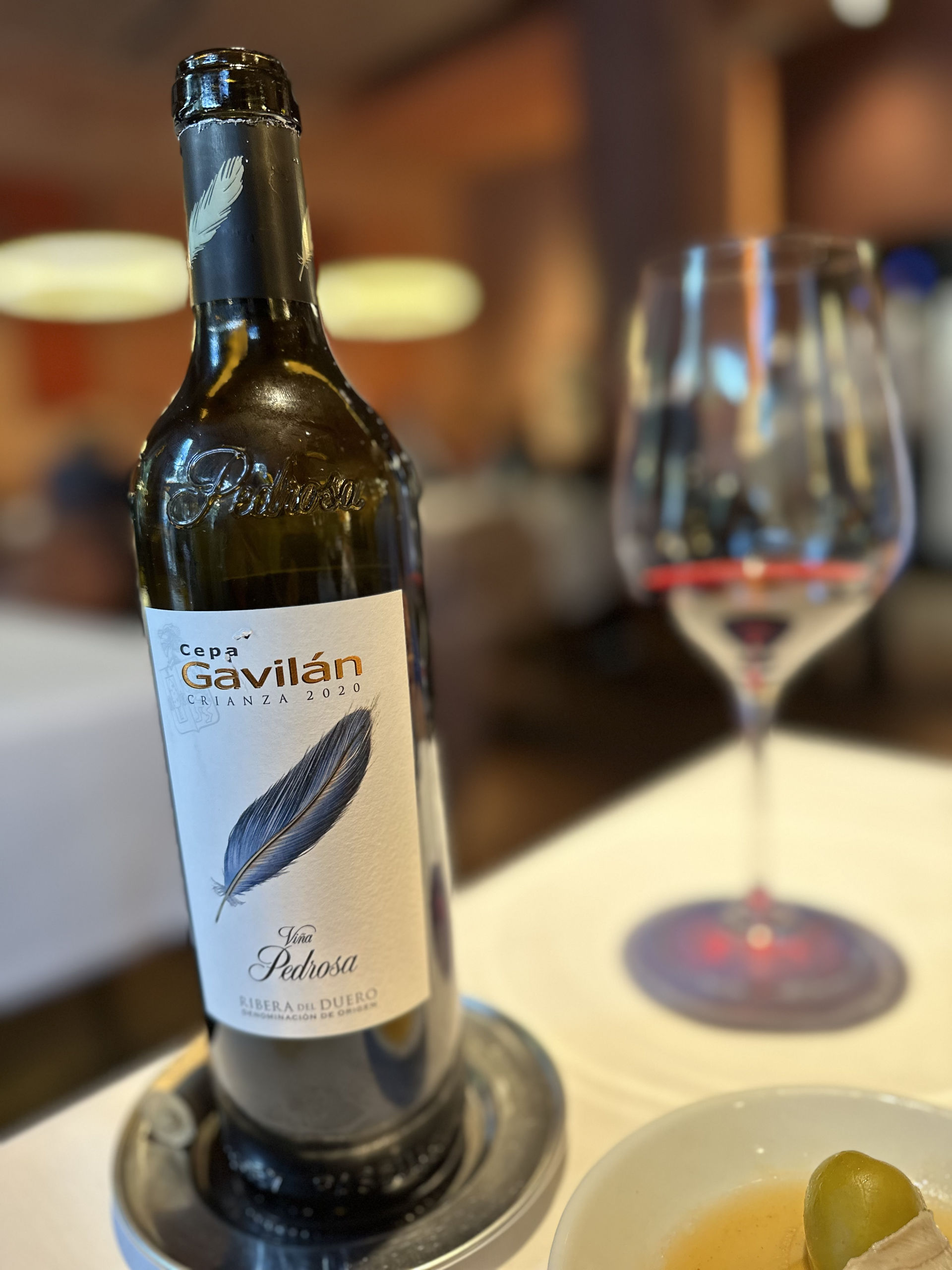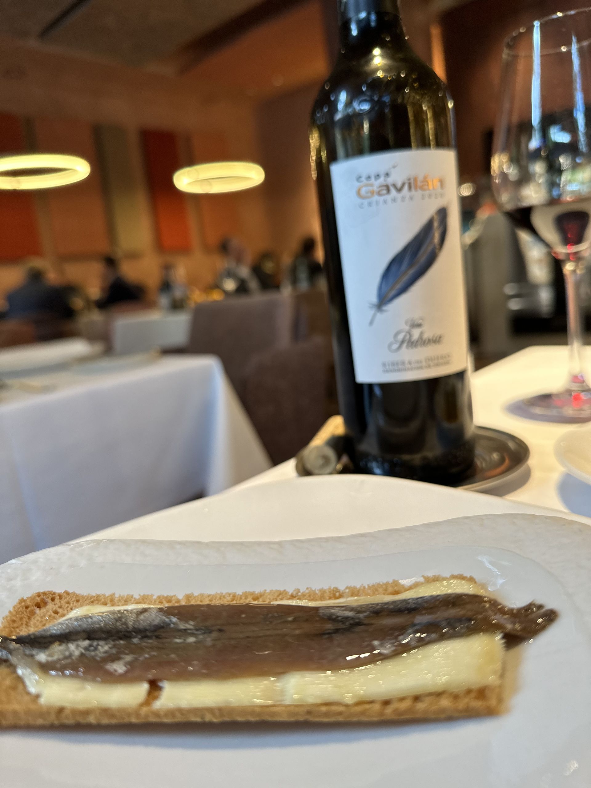 La carta líquida es amplia y con numerosas referencias nacionales e internacionales, además de espumosos y destilados de gran nivel. Nosotros acompañamos la comida con un tinto de Cepa Gavilán, elaborado por la Bodega Viña Pedrosa y con DO Ribera del Duero.
