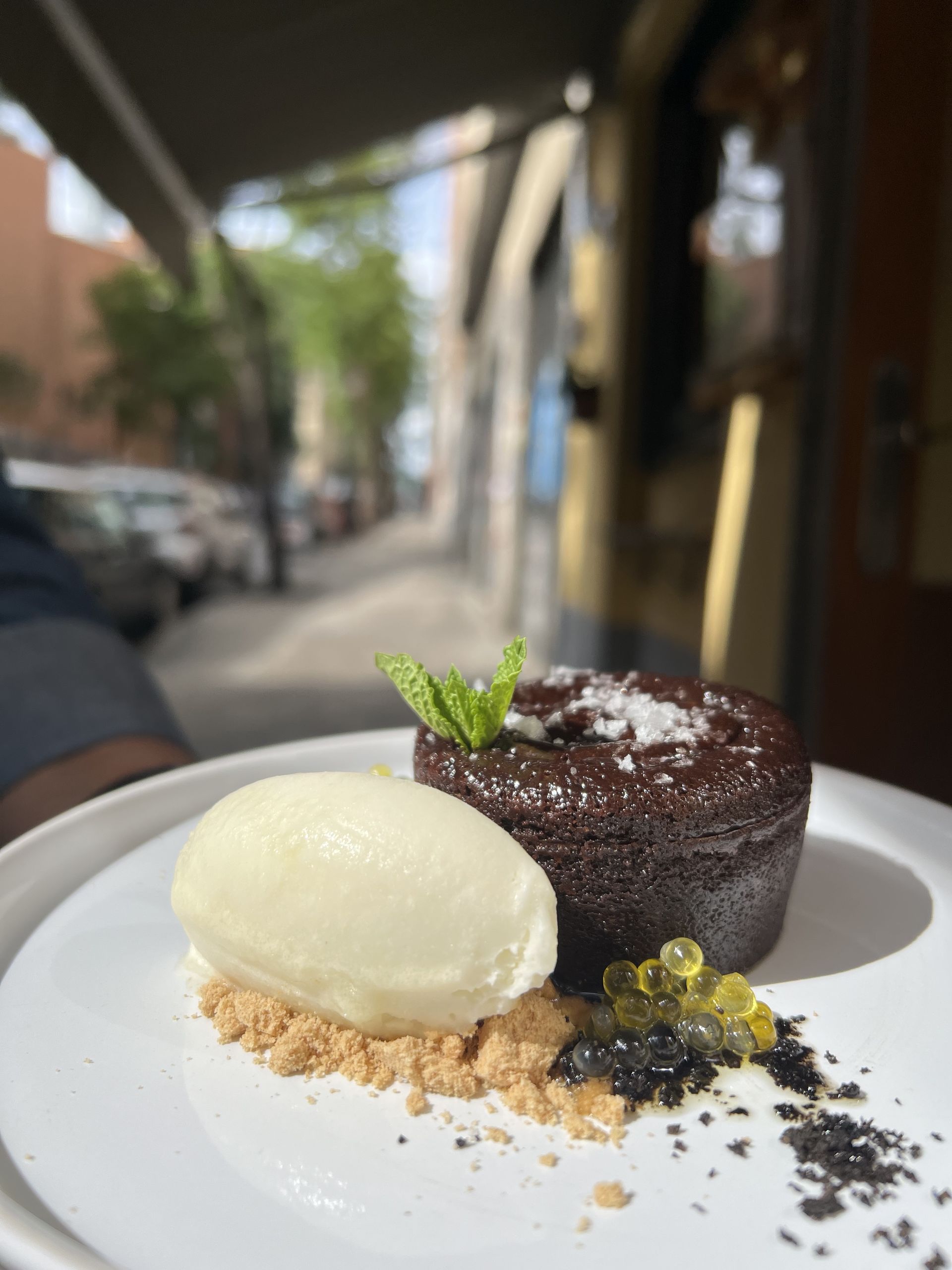 Con el postre, Carlos nos lleva a su infancia andaluza. Un recuerdo que le lleva a ese bocadillo con chocolate, aceite y sal que le preparaban en su casa y que lo ha trasladado al restaurante en forma de coulant, aceite y sal.
