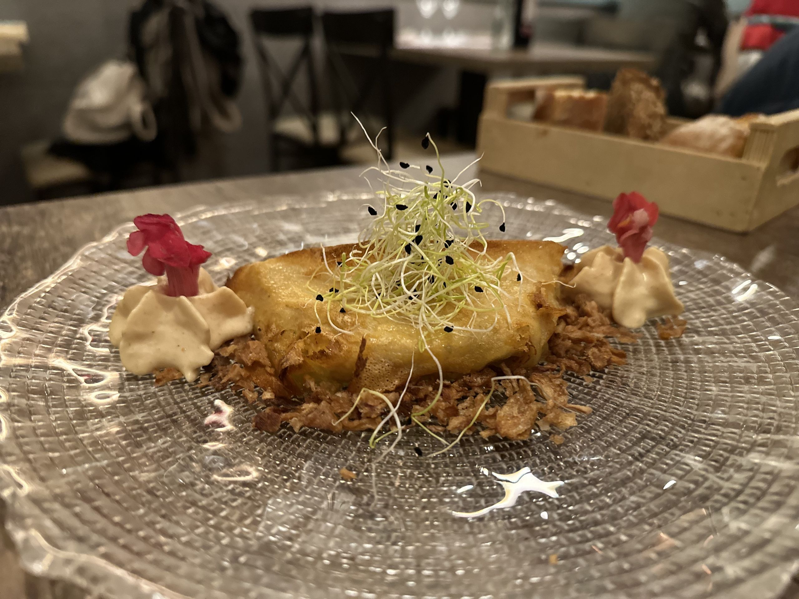 De la fusión de texturas y olores probamos una deliciosa pastela rellena de salmón y merluza, acompañado con un toque de frutas de hueso como el melocotón y la ciruela amarillas, verduras y fideos chinos. Además, la espuma es de fresa, plátano y un poquito de ras el hanut. Y se termina con dos texturas de cebolla, la primera crujiente y la segunda con un germinado de cebolla. Una maravilla que aglutina ese toque exótico marroquí aligerado con los toque afrutado.