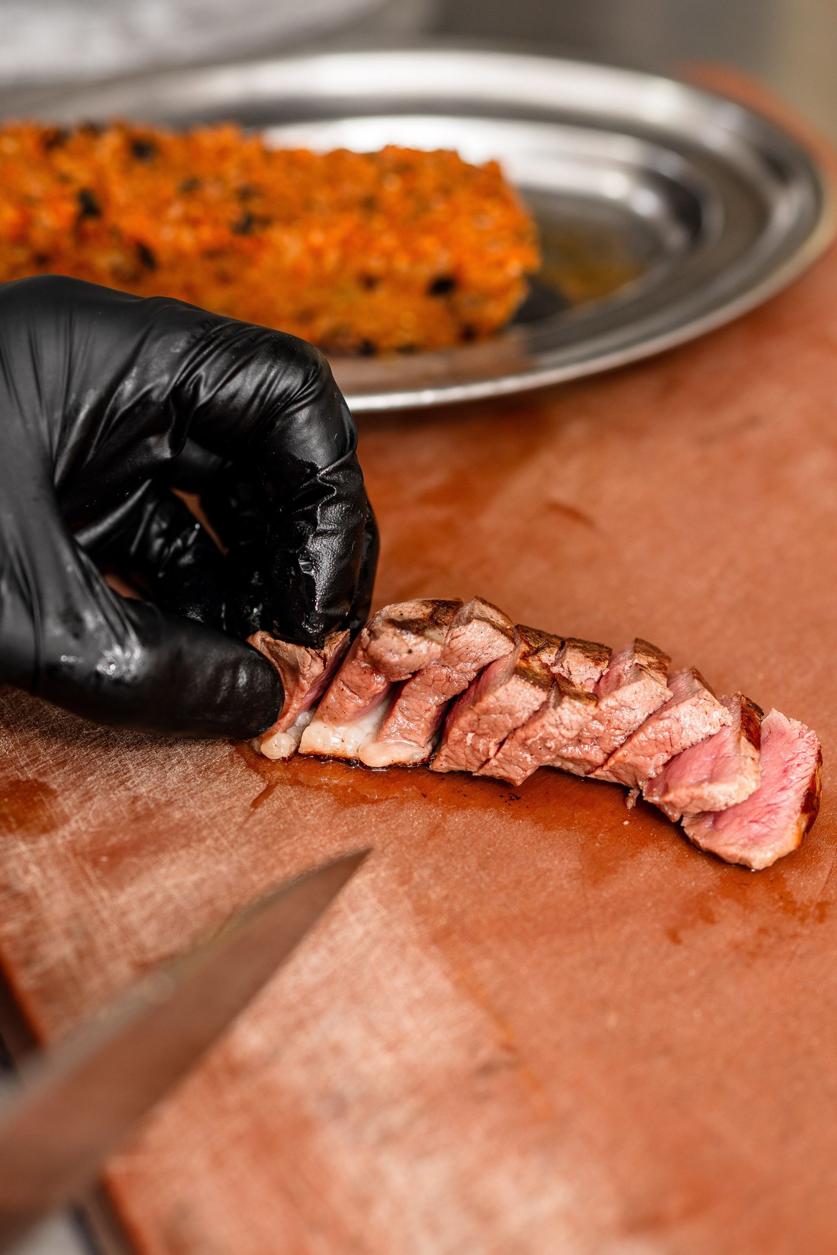 El chef termina de cortar el magret de pato para colocarlo encima del socarrat.