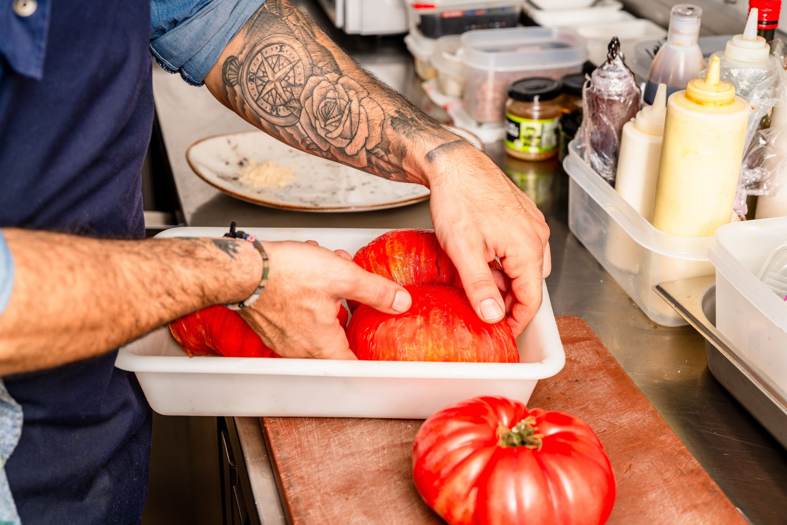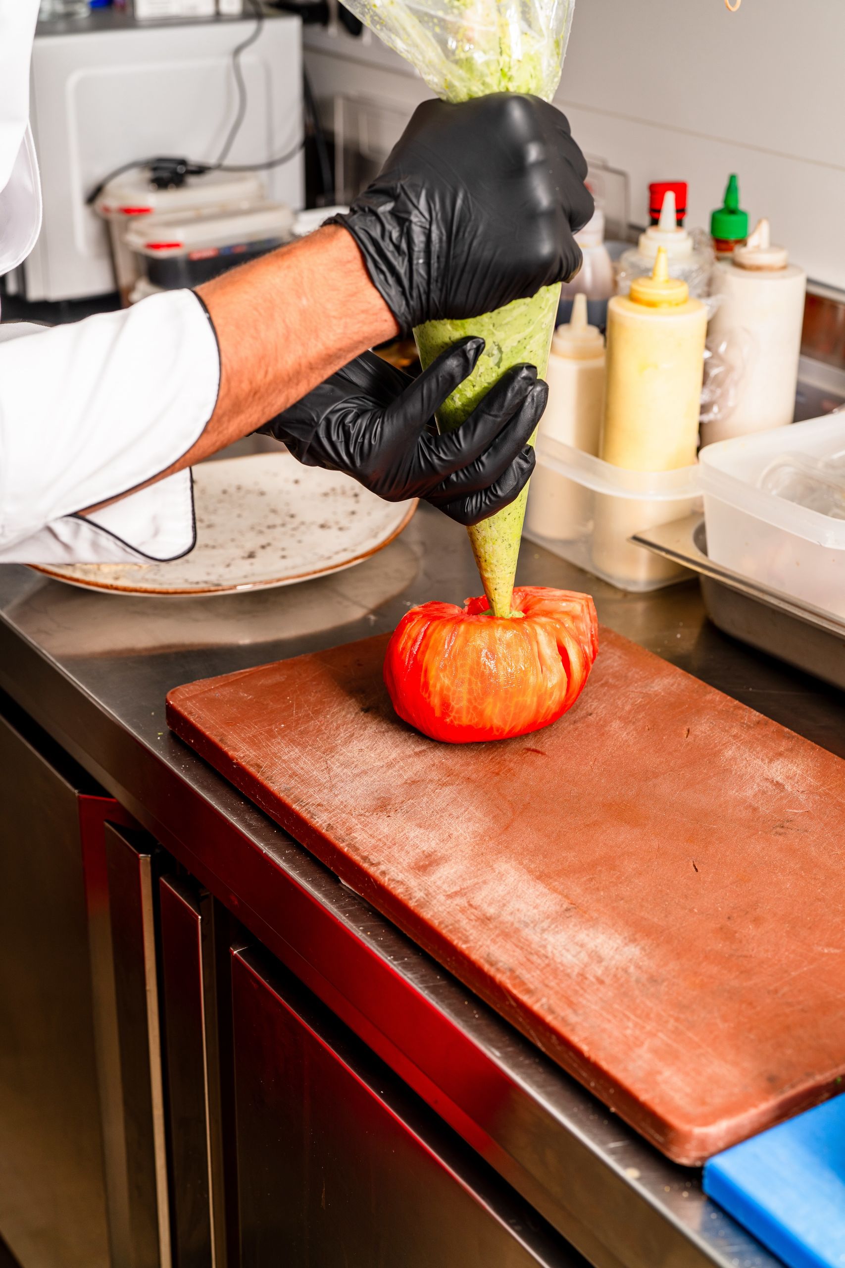 En este punto el chef rellena el tomate rosa de Motrol con la crema de albahaca.