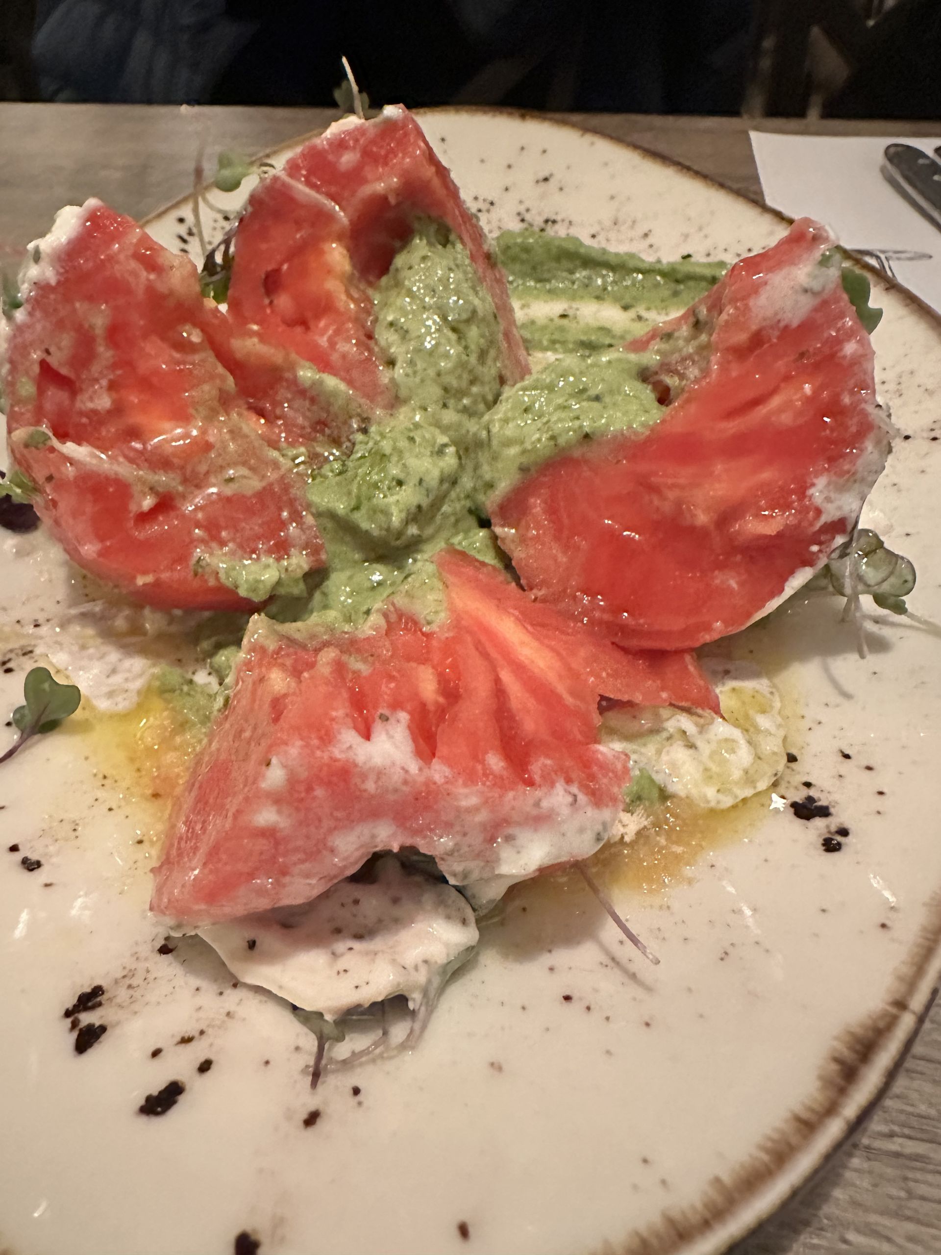 Increíble tomate de Graná relleno de crema de albahaca y burrata trufada. Una fruta de un tamaño considerable, de la variedad rosa de Motril en cuya base ponen un craker de ajo casero y encima del tomate la burrata trufada italiana. Un entrante que combina el maravilloso sabor de esta fruta considerada comunmente como verdura, con el toque de la crema de albahaca y la burrata con un sutil sabor a trufa.