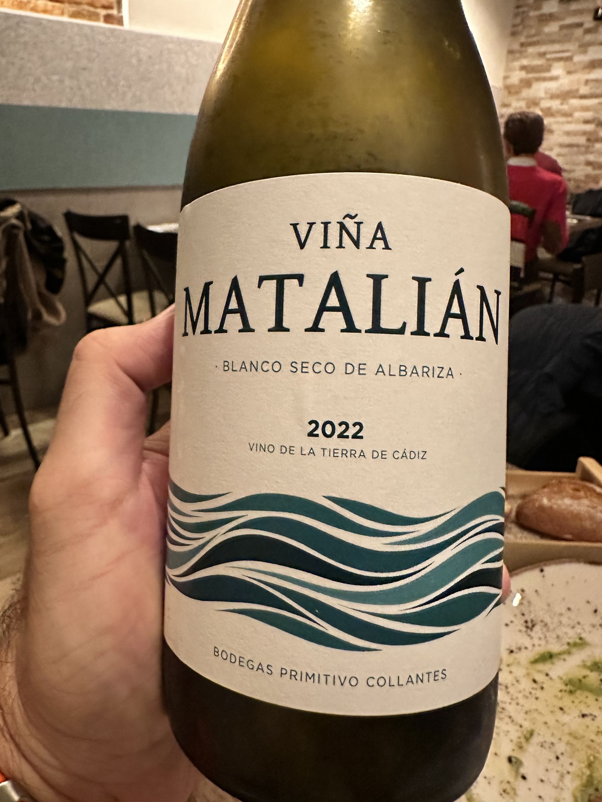 La carta cuenta con referencias que se salen de las habituales, que también las hay. En esta ocasión, maridamos la cena con la recomendación de Carlos, un buen vino blanco Viña Matalián, origen IGP Cádiz y elaborado por Bodegas Primitivo Collantes con 100% de Palomino fino.