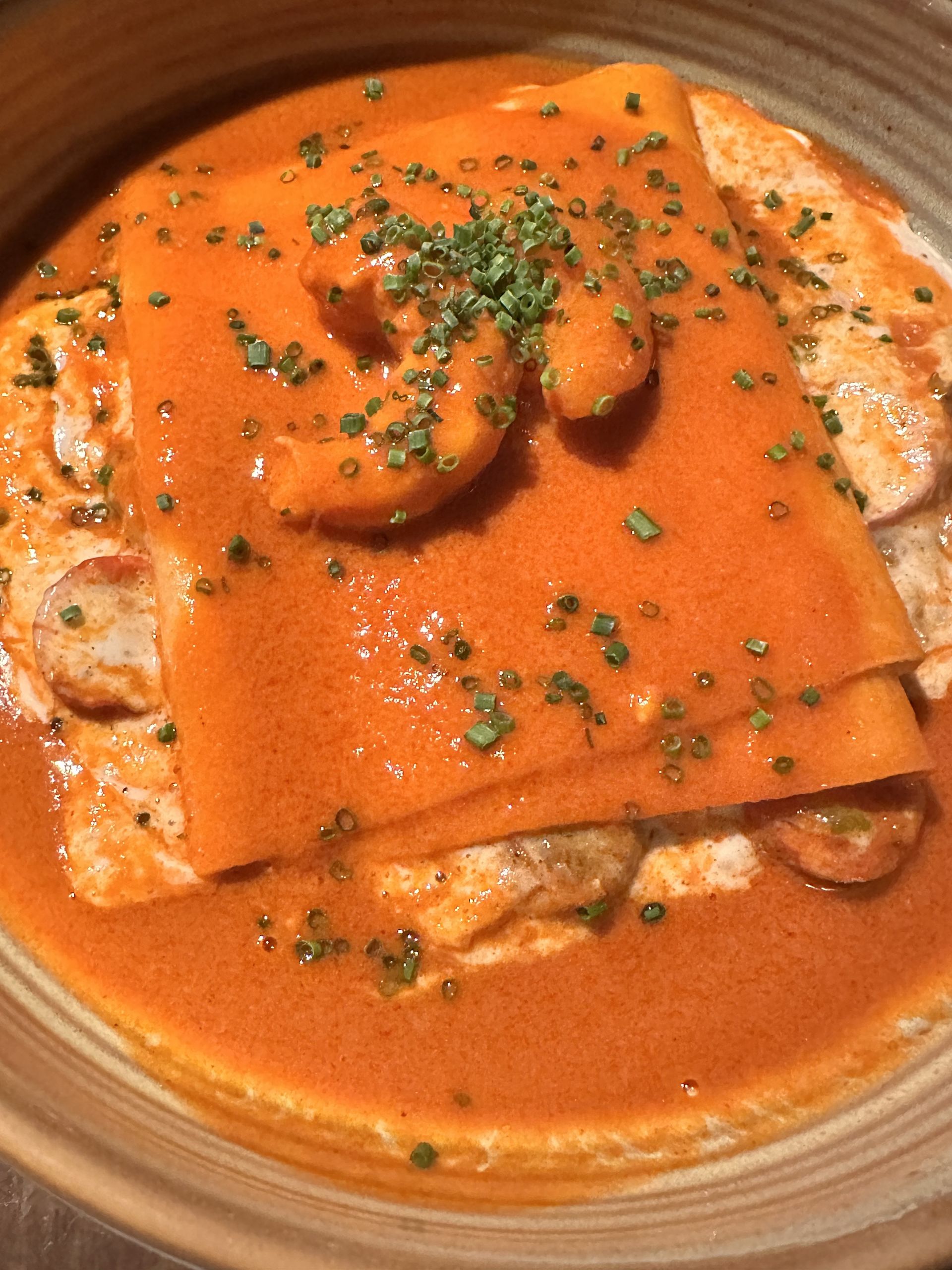 De quitarse el sombrero es la lámina de pasta casera, gamba roja y aguaturma, una especie de lasaña con una pasta perfectamente cocida y una salsa en la que el sabor de la gamba roja impregna todo el plato, con un acompañamiento perfecto del aguaturma, también conocido como tupinambo.