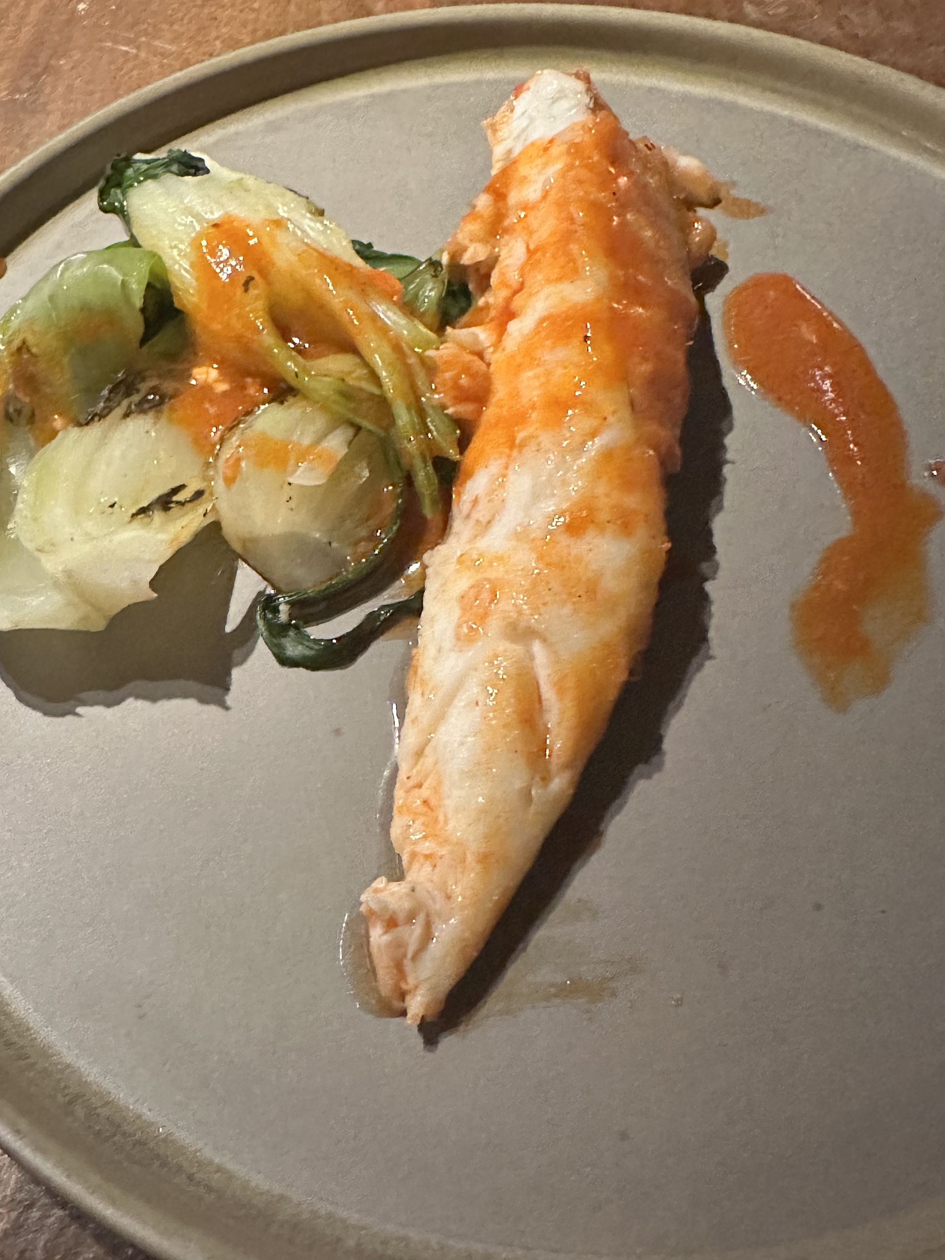 De esas recetas sencillas y sin más artificios que el producto de calidad y las salsas probamos un buenísimo rape de tripa negra, salsa bordalesa y pak choi, presentado en la mesa y emplatado para poder disfrutar de un plato con mucho sabor.