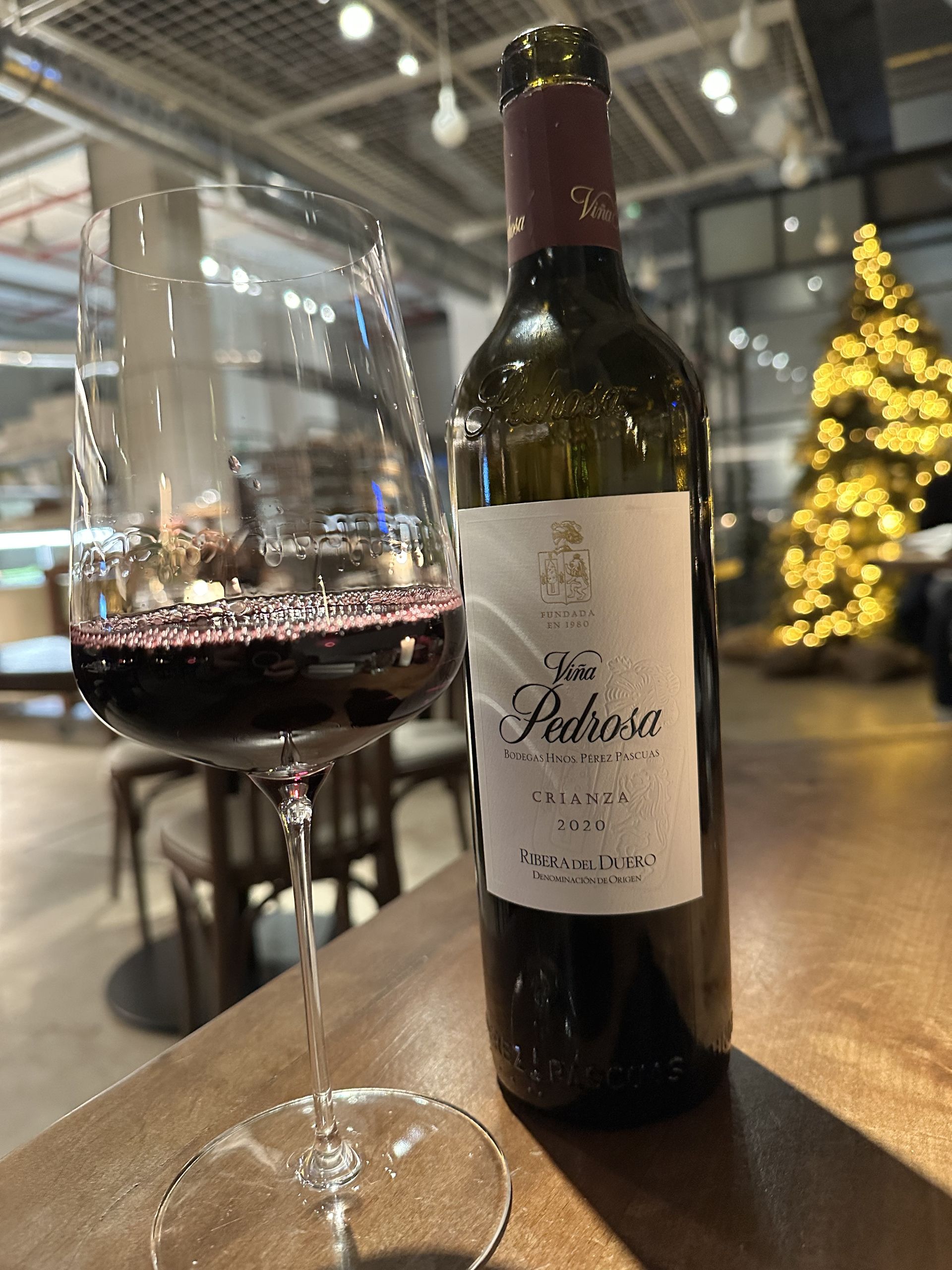 La carta de vinos sigue en la misma línea que la cocina y respeta lo artesanal y el producto. Nosotros disfrutamos la cena con un buen vino tinto Viña Pedrosa, con DO Ribera del Duero y elaborado por Bodegas Hermanos Pérez Pascuas.