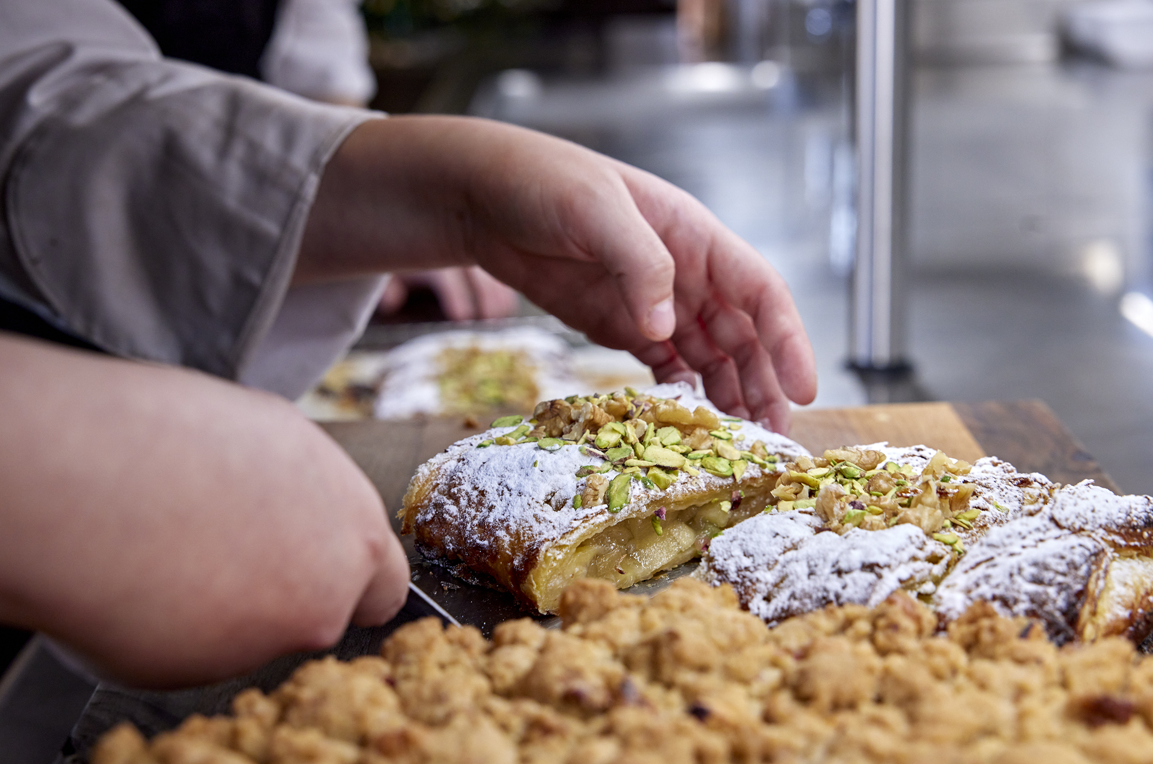 La bollería recién horneada es parte fundamental de The Omar, con tartas que varían a diario, como este brazo de pistacho con chantillly y teja de nuez.