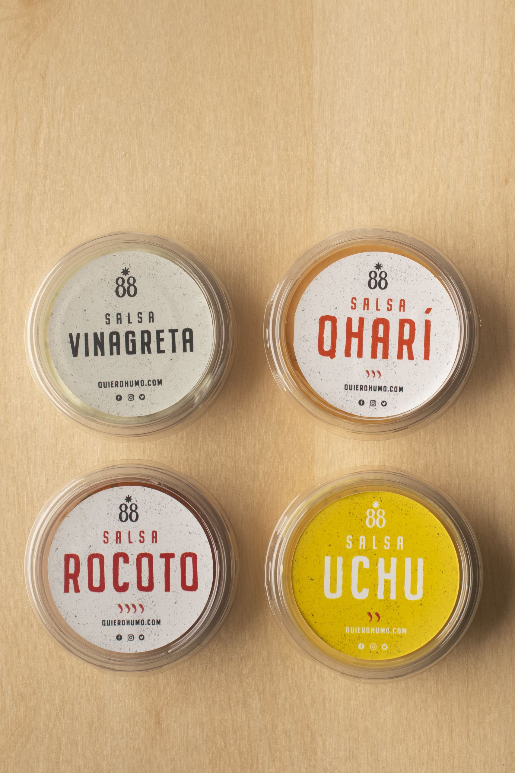 Para acompañar el pollo, Jhosef Arias ha creado unas salsas que se elaboran de manera artesanal en el restaurante y que son una auténtica maravilla. Además de la de chumichurri, tienes la salsa Uchu, una crema de ají hecha a base de ají amarillo ahumado y huacatay; la salsa Qhari, que viene de cariño, para valientes hecha a base de rocoto; la Rocoto, un ají picante que se sirve con cilantro y que es apta para los bravos; la Olivo, una salsa de aceituna peruana de botija traída directamente del departamento de Moquegua; y la Vinagreta, perfecta para la ensalada.