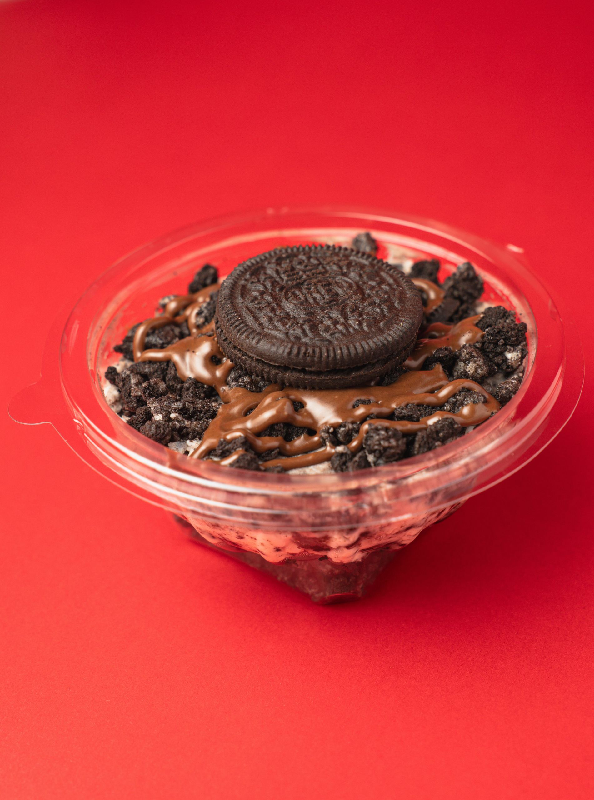 Oreo Hermanos Cheese Cake, mezcla de mascarpone italiano y queso crema americano con cobertura de galletas oreo y dulce de chocolate.