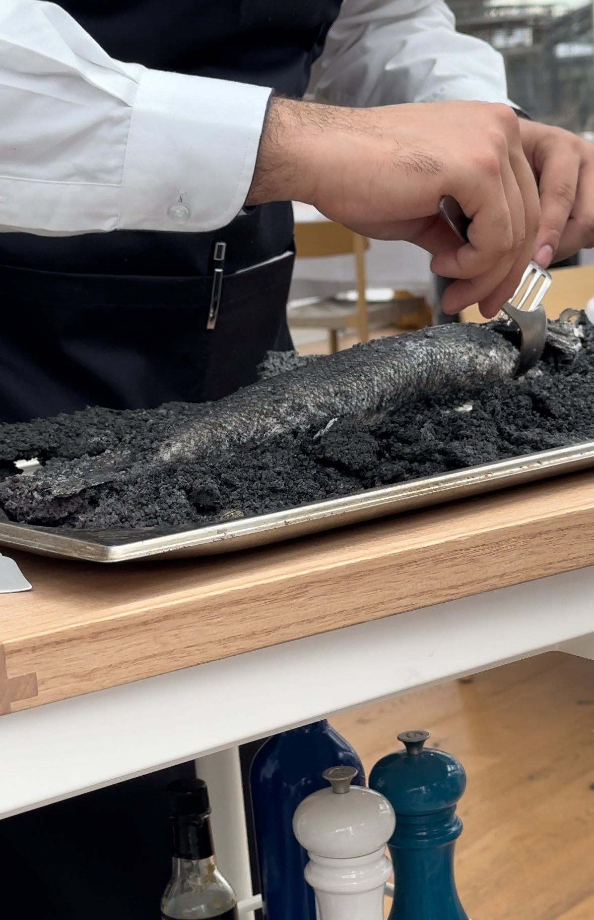 Una fresca y sabrosa lubina con costra de sal negra, a la sal le añaden alguna hierba aromática para que la carne del pescado se impregne de su aroma.