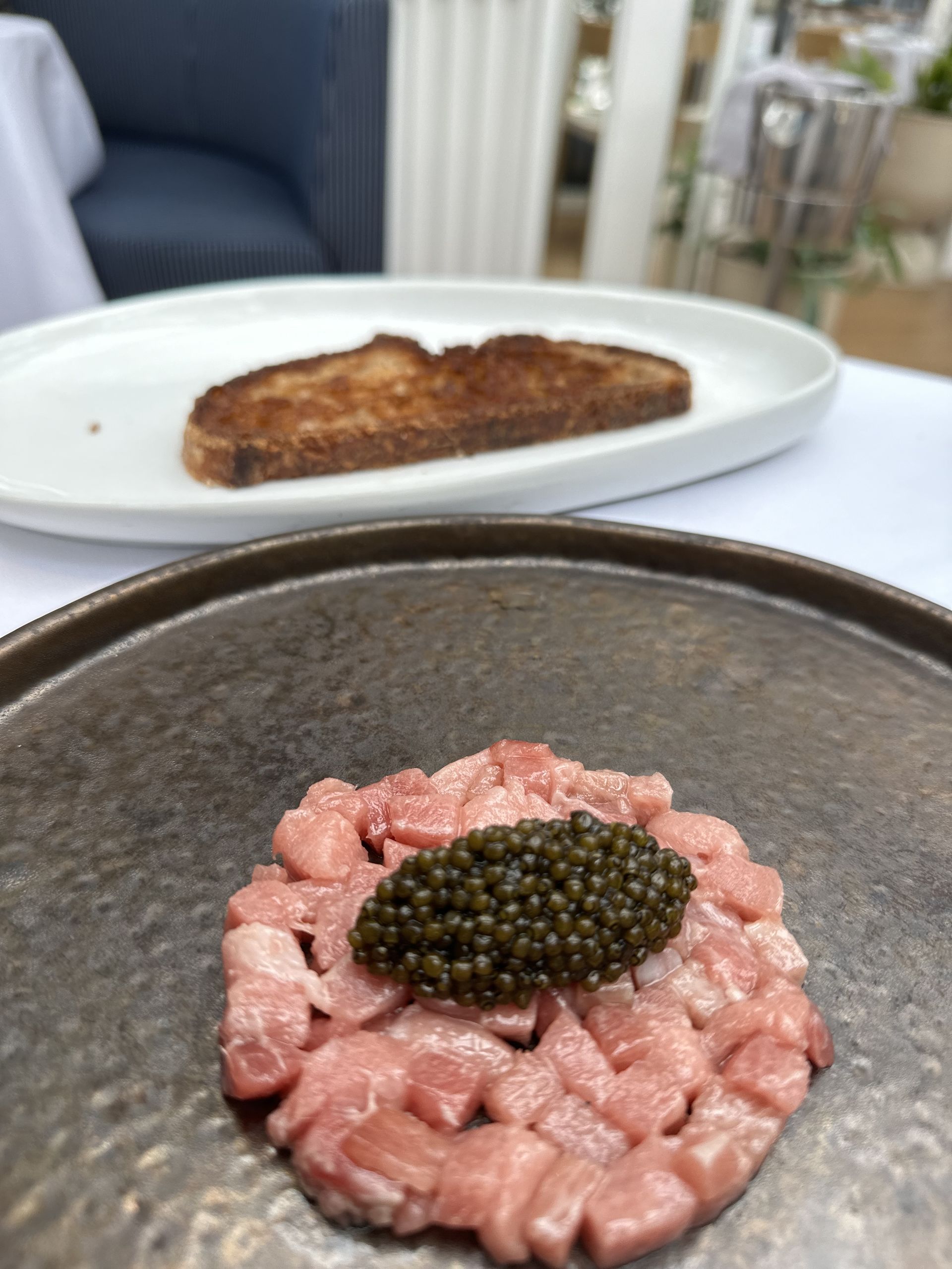 Deliciosa tosta de o’toro con umai caviar. El atún está aliñado con grasa de jamón lo que le da un contraste espectacular, unido al sabor yodado del caviar y la tosta hace que cada bocado sea puro umami.