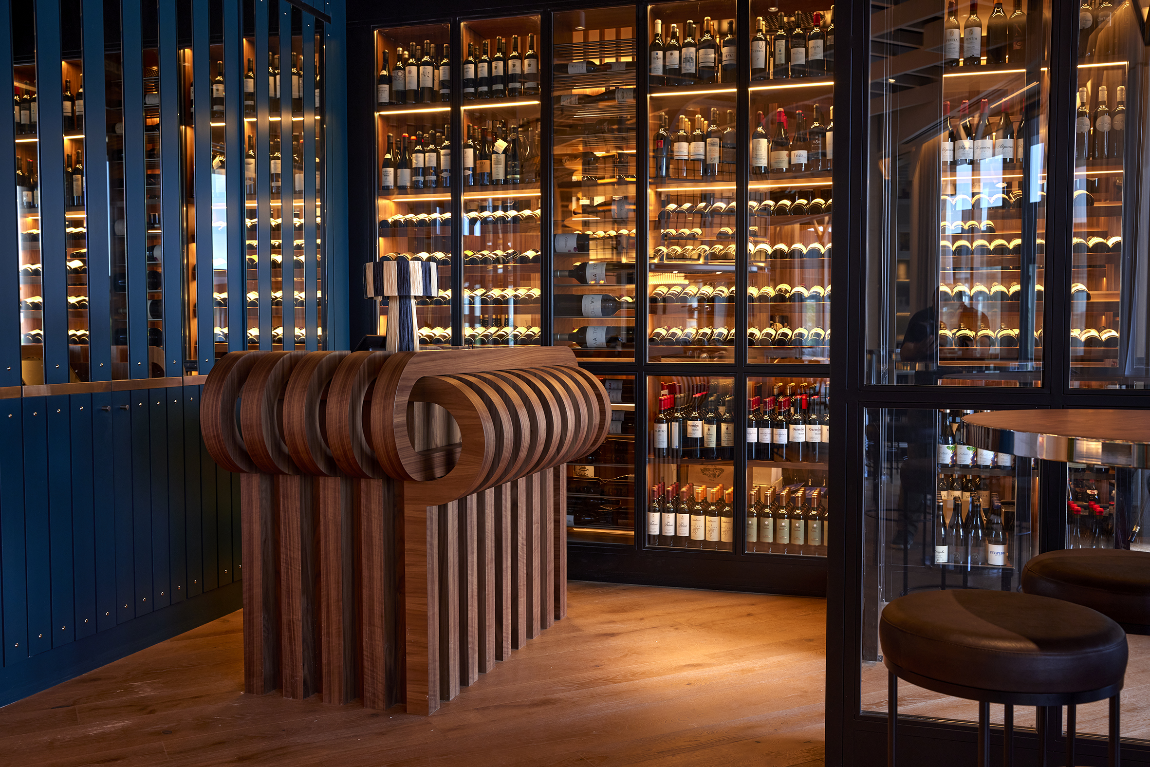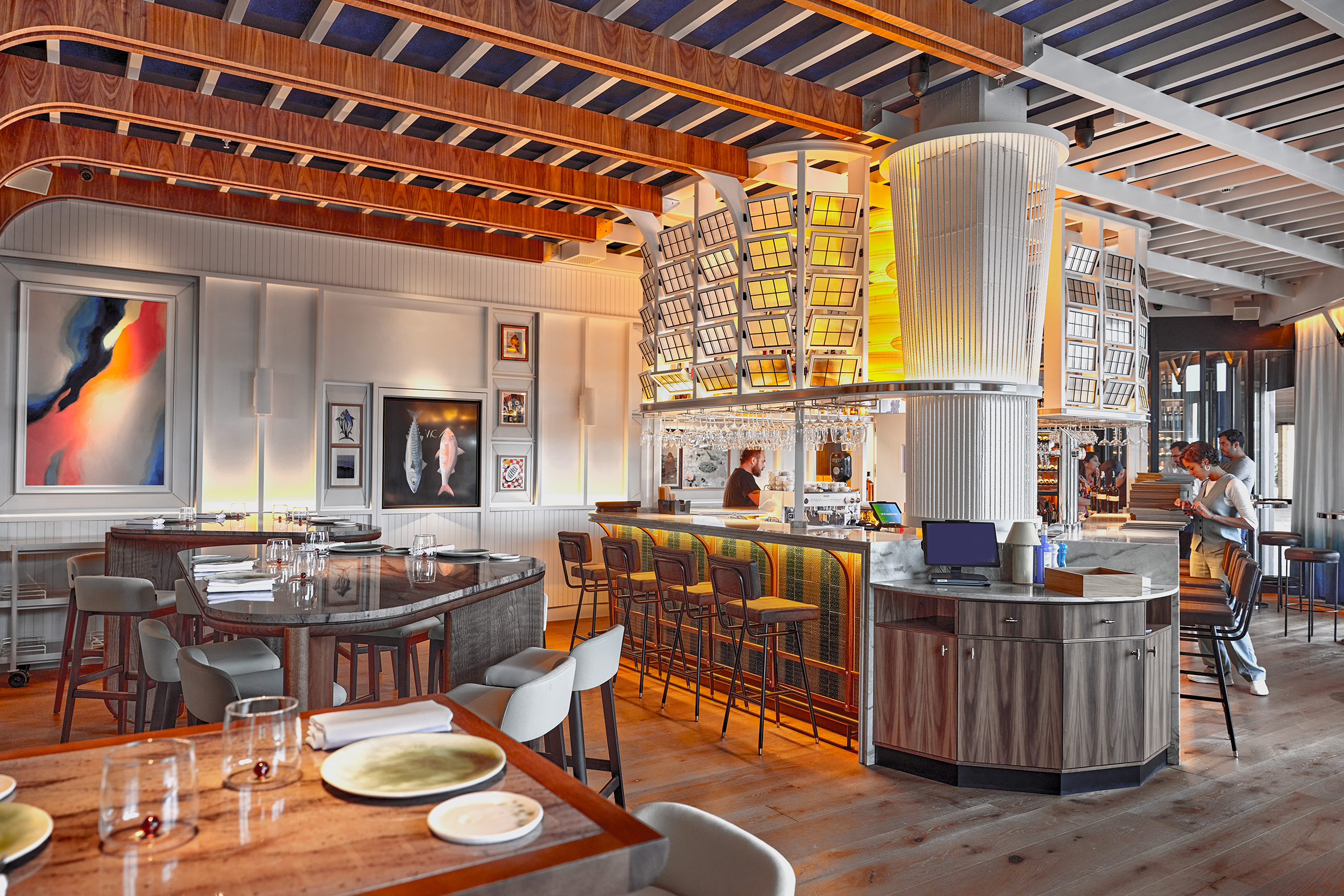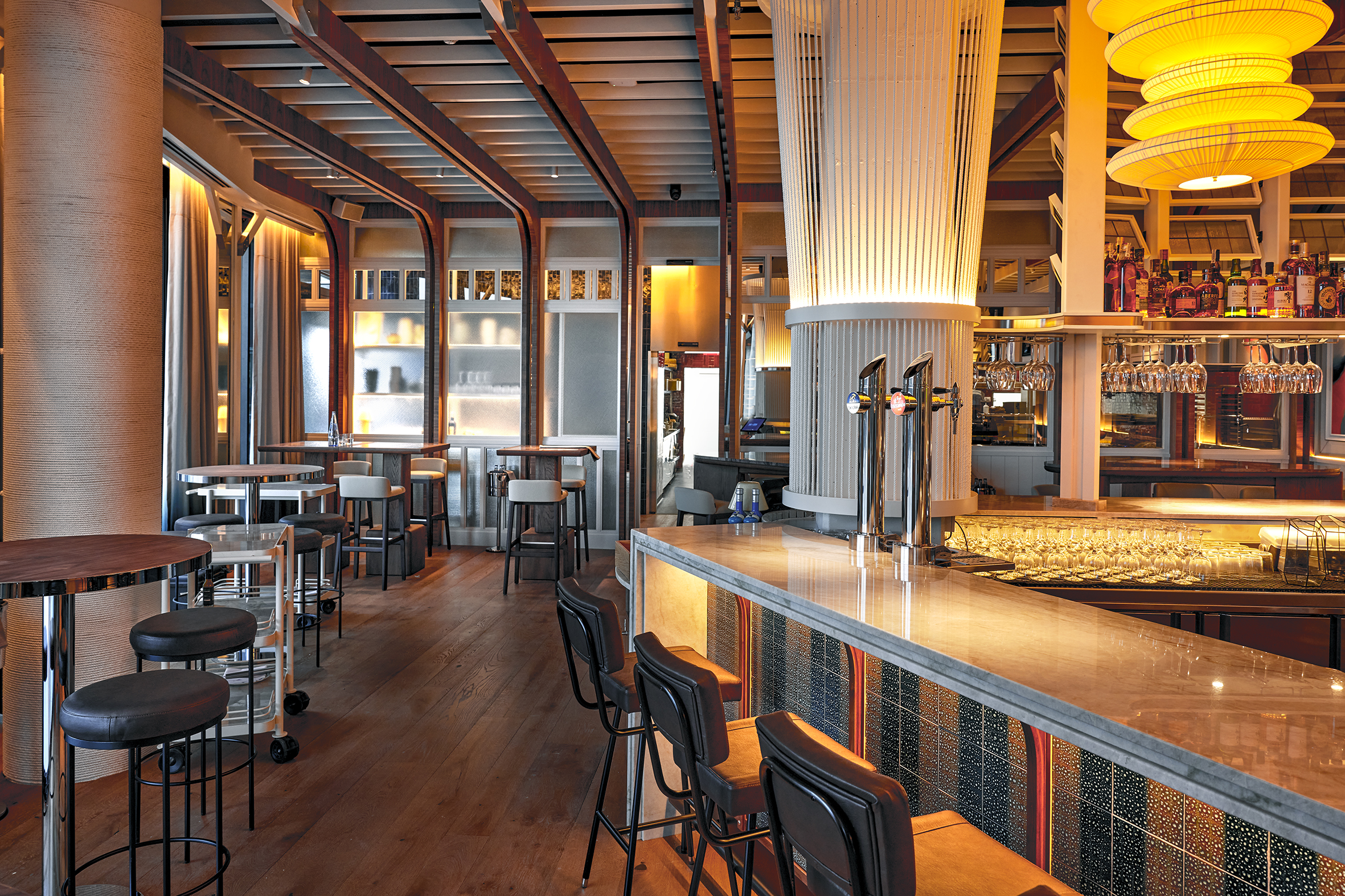La zona interior cuenta con una imponente barra y mesas altas que son perfectas para una comida o picoteo informal.