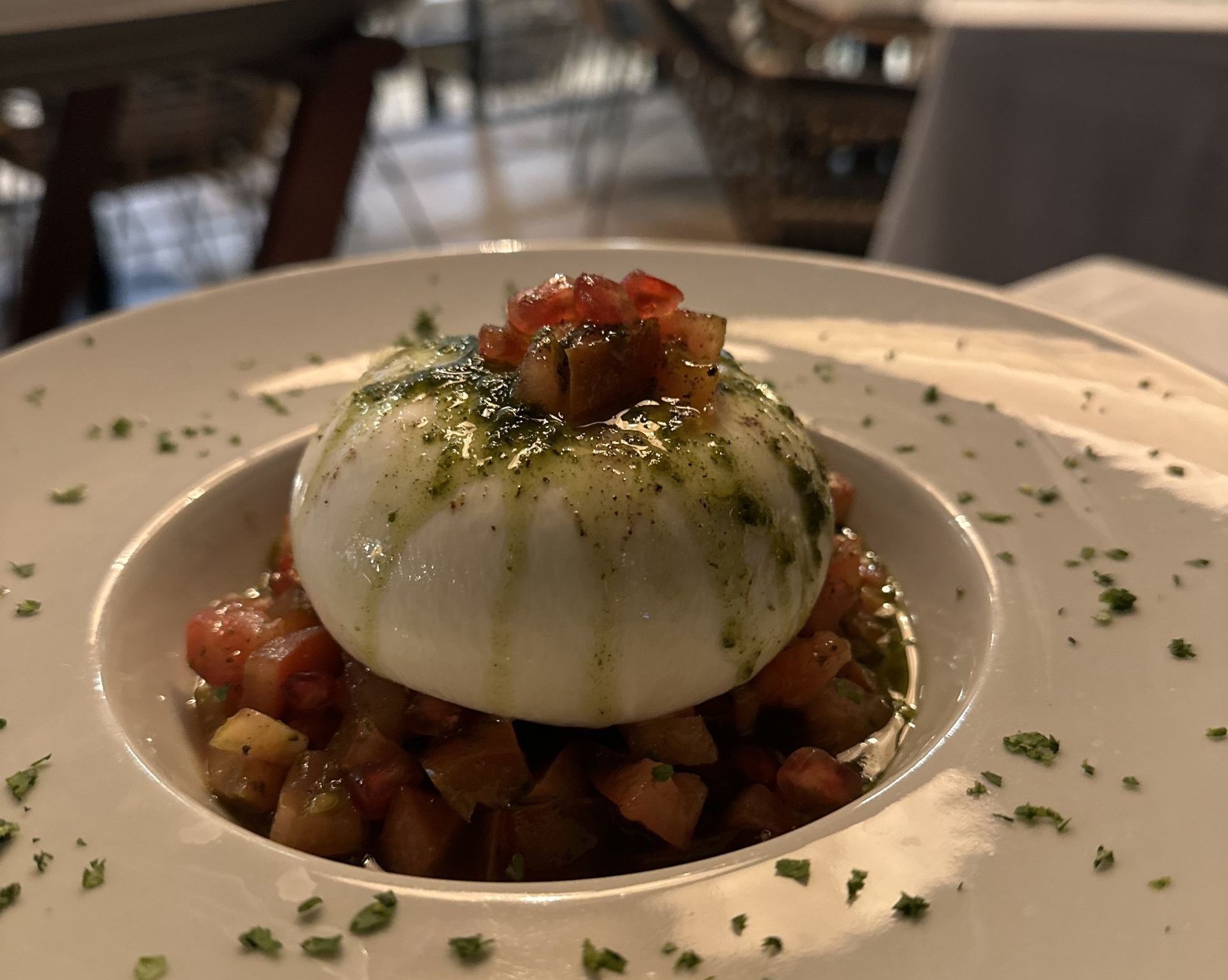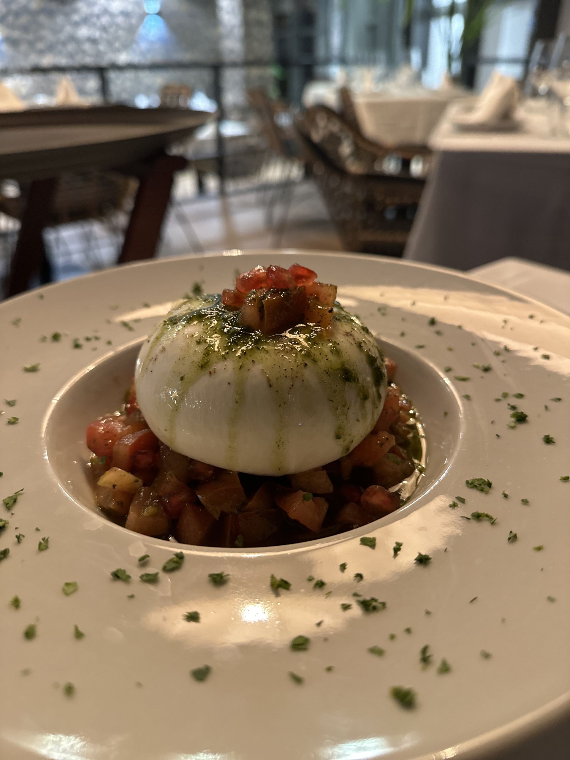 Una sublime burrata con tomate, albahaca y granada. Presentada en la mesa con la burrata entera sobre una cama de tartar de tomate y granada y que al romper la burrata saca toda su esencia para fundirse, primero en el plato, y luego en el paladar con ese aceite de albahaca que le da el toque perfecto.