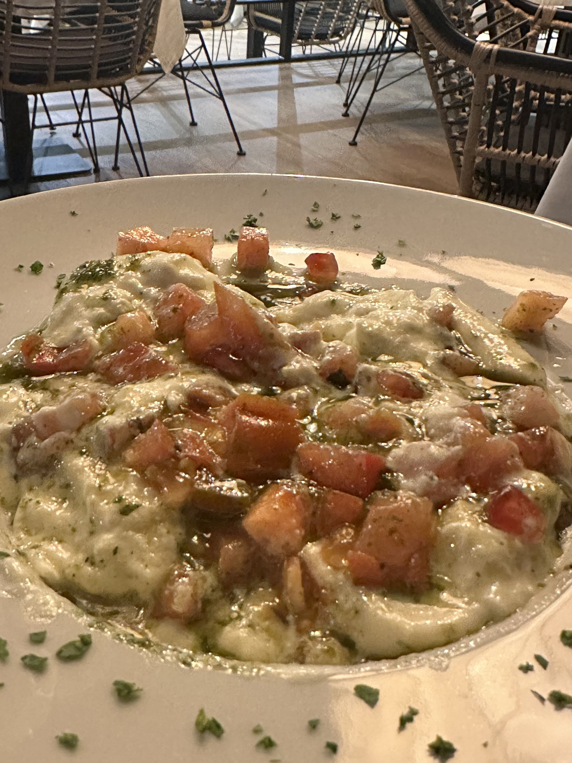 La burrata con el tartar de tomate, la granda y el acite de albahaca todo mezclado y listo para disfrutar.