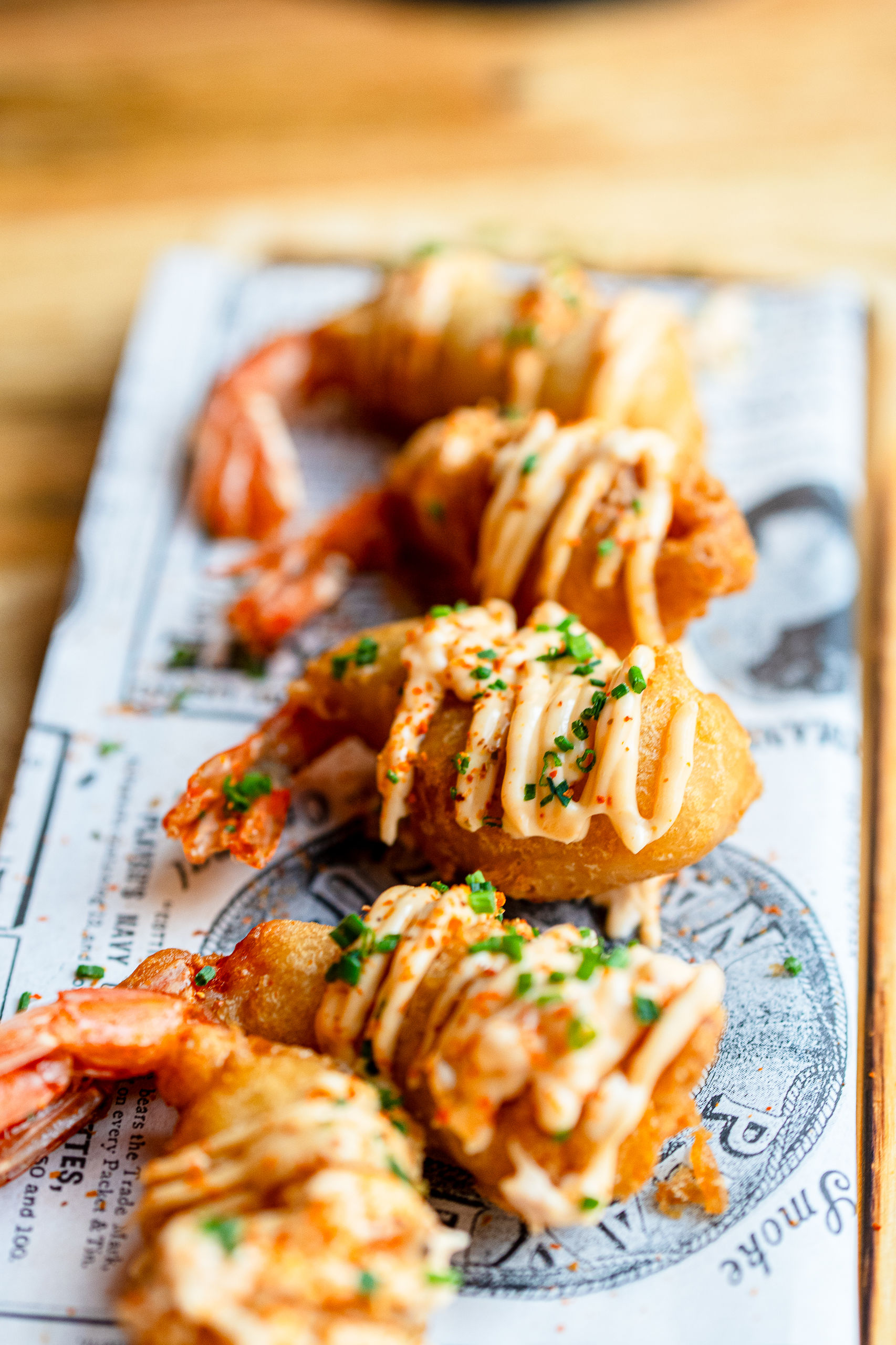 Deliciosas colas de langostinos en tempura con un toque picante de mayo con kimchi coreano. Un rebozado sutil que envuelve un marisco fresco y en su punto.