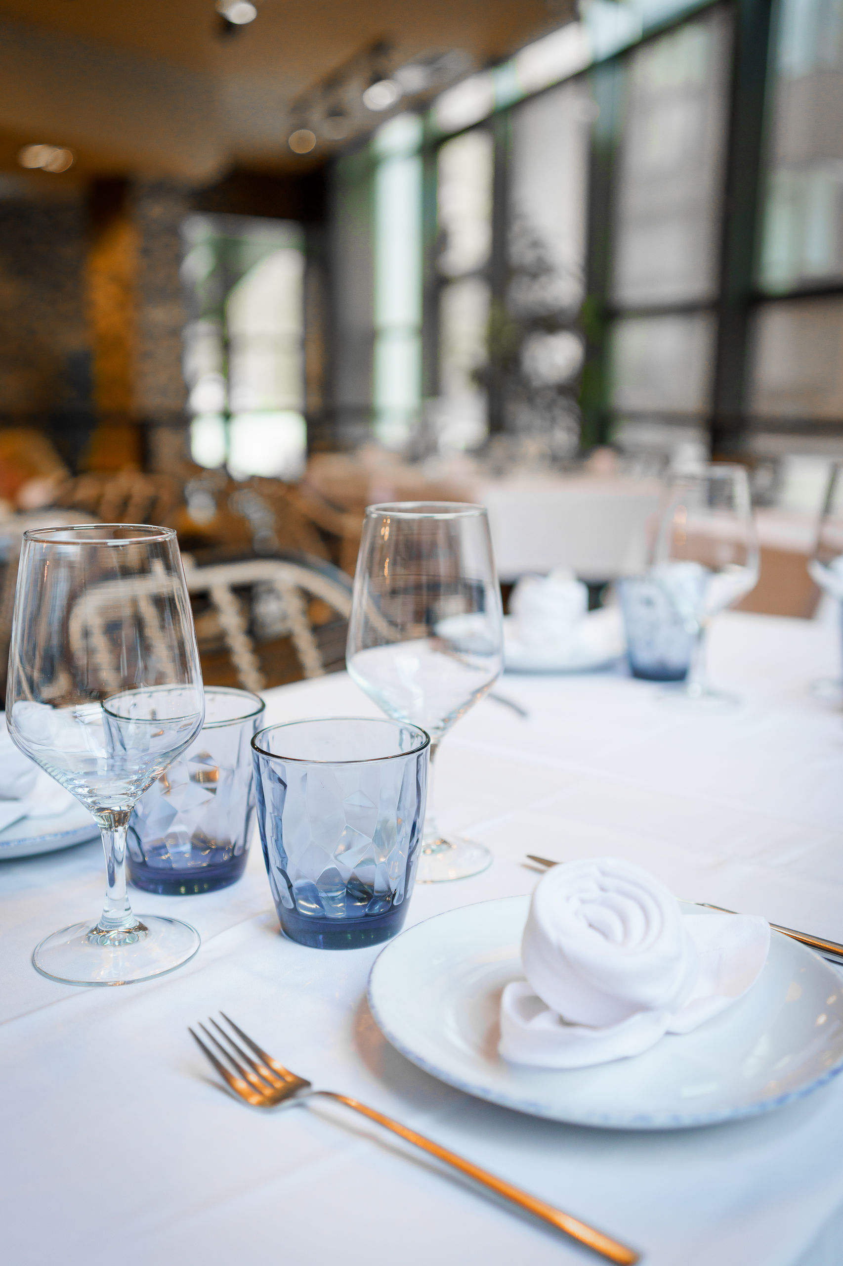 Las mesas perfectamente revestidas de su mantel de tela blanco.